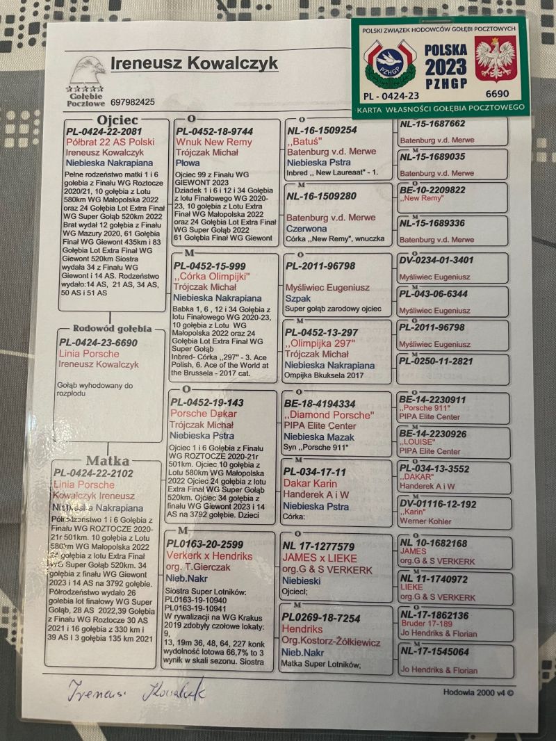 Oryginalny gołąb z hodowli Ireneusz Kowalczyk -Wnuk "Batuś", "Olimpijka 297" (Półbrat 22 Asa Polski) x Wnuczka "Diamond Porsche" Szczegóły pochodzenia w rodowodzie. Gołębie po kuracji przygotowane do lęgów. Więcej informacji pod numerem telefonu: 667 324 002 - Transport prywatnym kurierem, odbiór na wystawie ogólnopolskiej lub odbiór osobisty.
