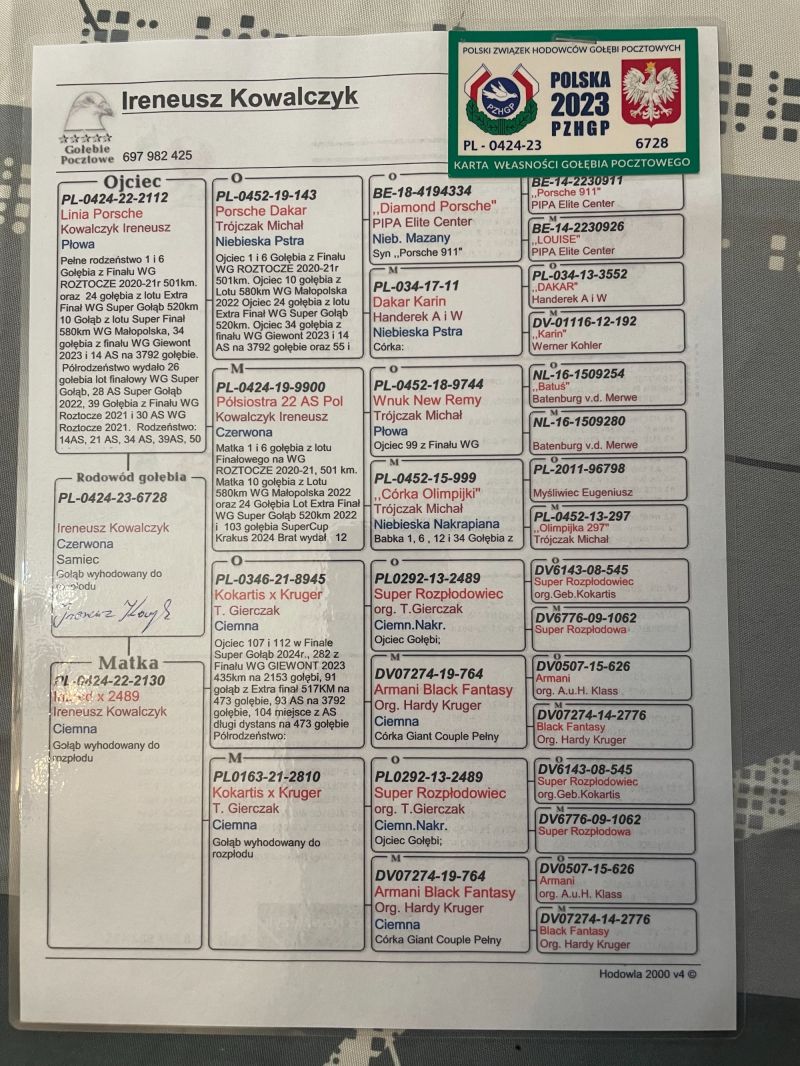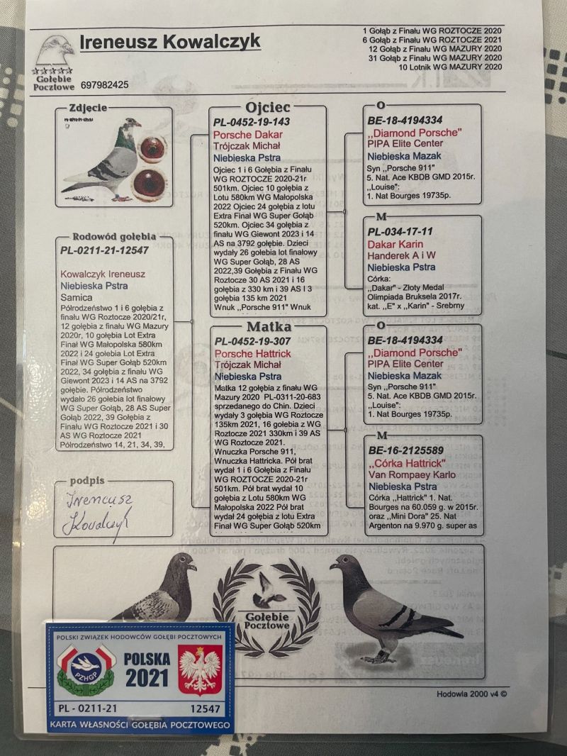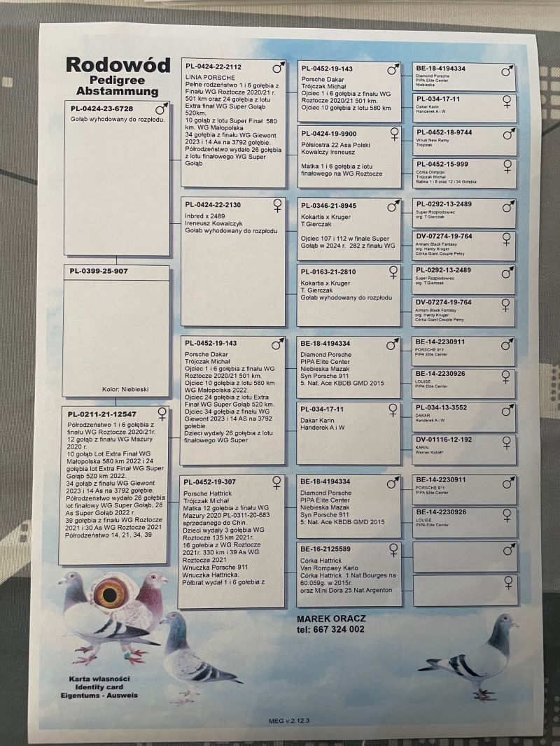 Oryginalny gołąb z hodowli Marek Oracz - Linia Porsche x Podwójna wnuczka "Diamond Porsche" (Matka posiada certyfikat DNA) - Rodzeństwo uczestniczyło na OLR Mazury 2025r. Szczegóły pochodzenia w rodowodzie. Gołębie po kuracji przygotowane do lęgów. Więcej informacji pod numerem telefonu: 667 324 002 - Transport prywatnym kurierem, odbiór na wystawie ogólnopolskiej lub odbiór osobisty.