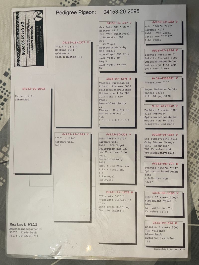 Oryginalny gołąb z hodowli Hartmut Will - Prawnuczka "Hurrican 51"