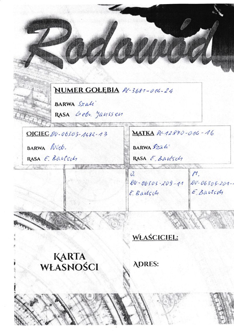 PL-014-24-3681 Unikat - Wnuk oryginalnych gołębi z hodowli Braci Janssen