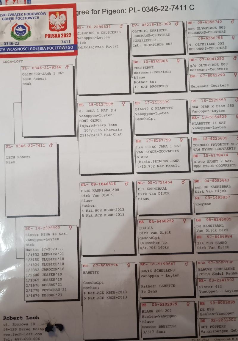 Samiec Linia Leo HEREMANS. Możliwość odbioru gołąbka 10.01.2026 na wystawie ogólnopolskiej w Katowicach. Wysyłka kurierem lub odbiór osobisty