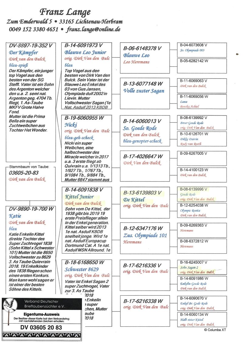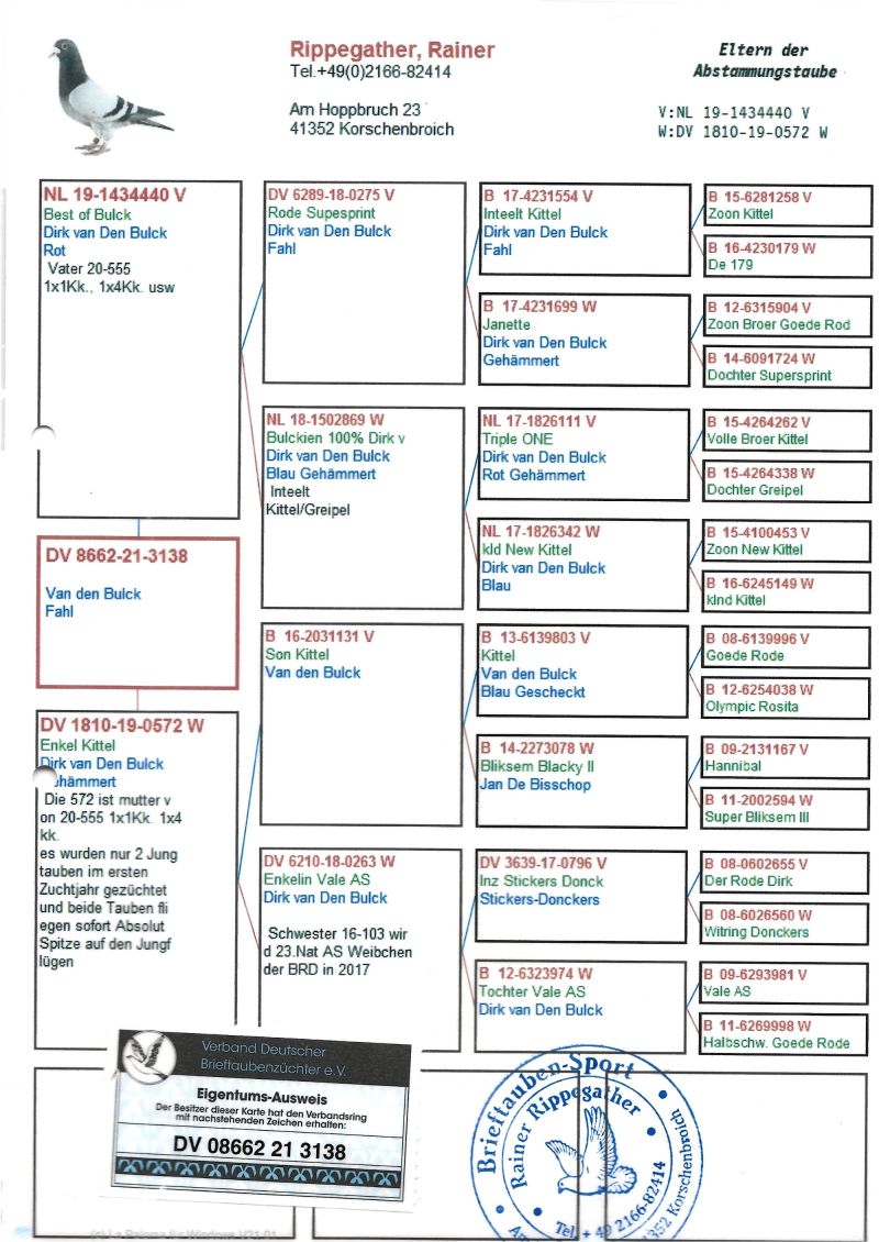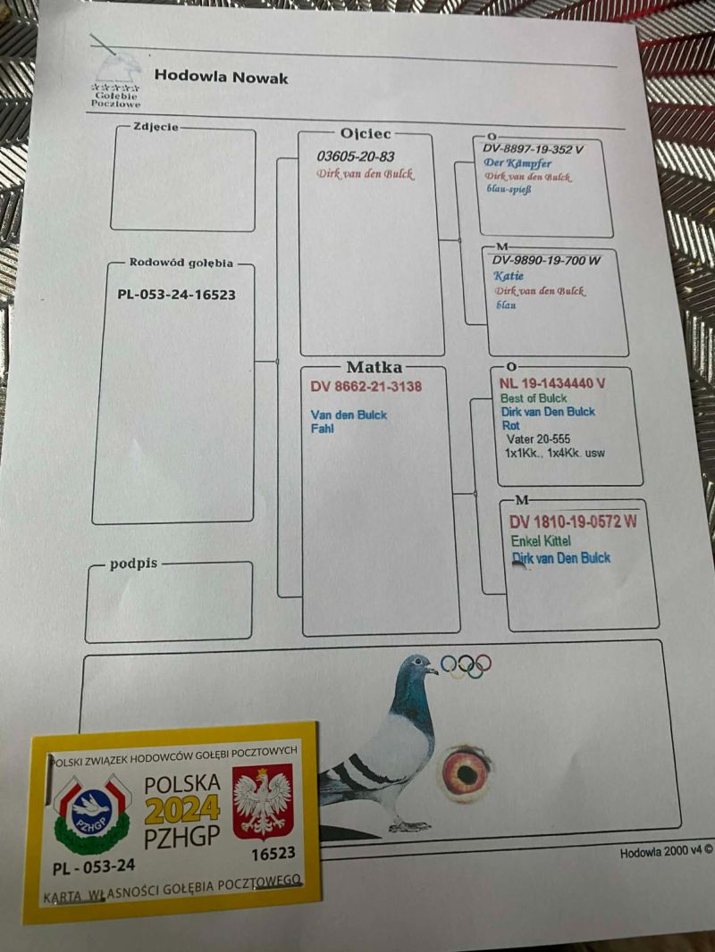 Samczyk z rocznika 2024 z gołębi Dirka Van den Bulck na zdjęciach rodowody rodziców możliwa wysyłka lub odbiór na wystawie