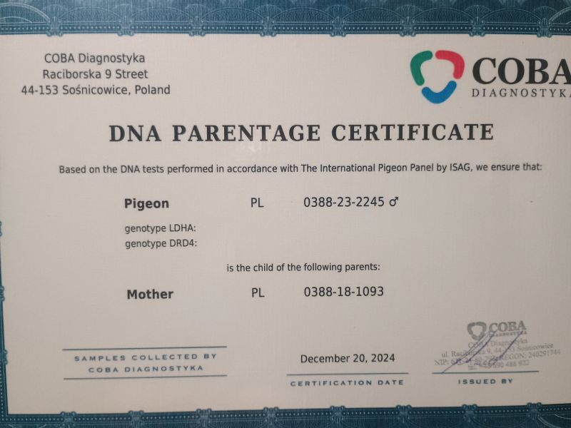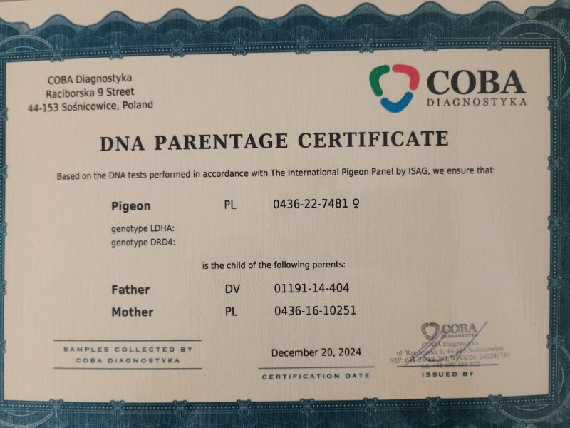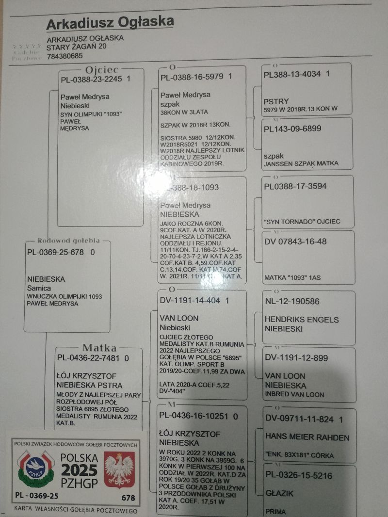 PL-0369-25-678 SYN OLIMPIJKI 1093 P.MEDRYSA X PÓŁSIOSTRA 6895 K.LÓJ CERTYFIKAT DNA