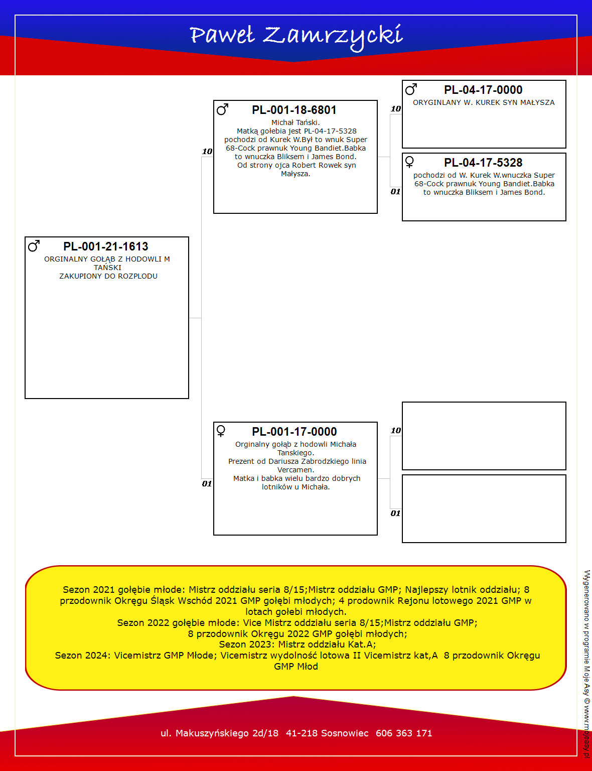 Oryginalny samiec z hodowli M.Tański. Szczegóły pochodzenia w rodowodzie. Możliwa wysyłka kurierem (szacunkowy koszt około 150 zł), odbiór osobisty lub odbiór na wystawie ogólnopolskiej. Kontakt: 606363171