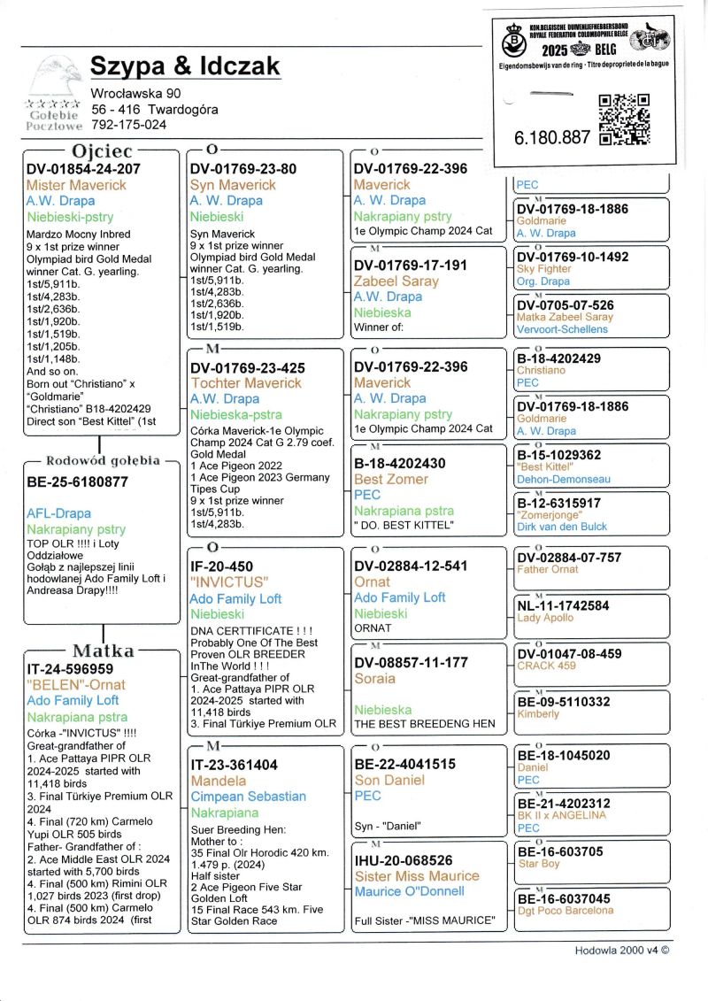 Profesjonalna hodowla z wieloletnim doświadczeniem, posiadająca w swoim stadzie materiał najwyższej światowej klasy. Więcej informacji w załączonych materiałach oraz pod nr tel. 792-175-024 Oferowany gołąb to prawdopodobnie SAMIEC. Płeć pisana orientacyjnie Wysyłka 100 zł