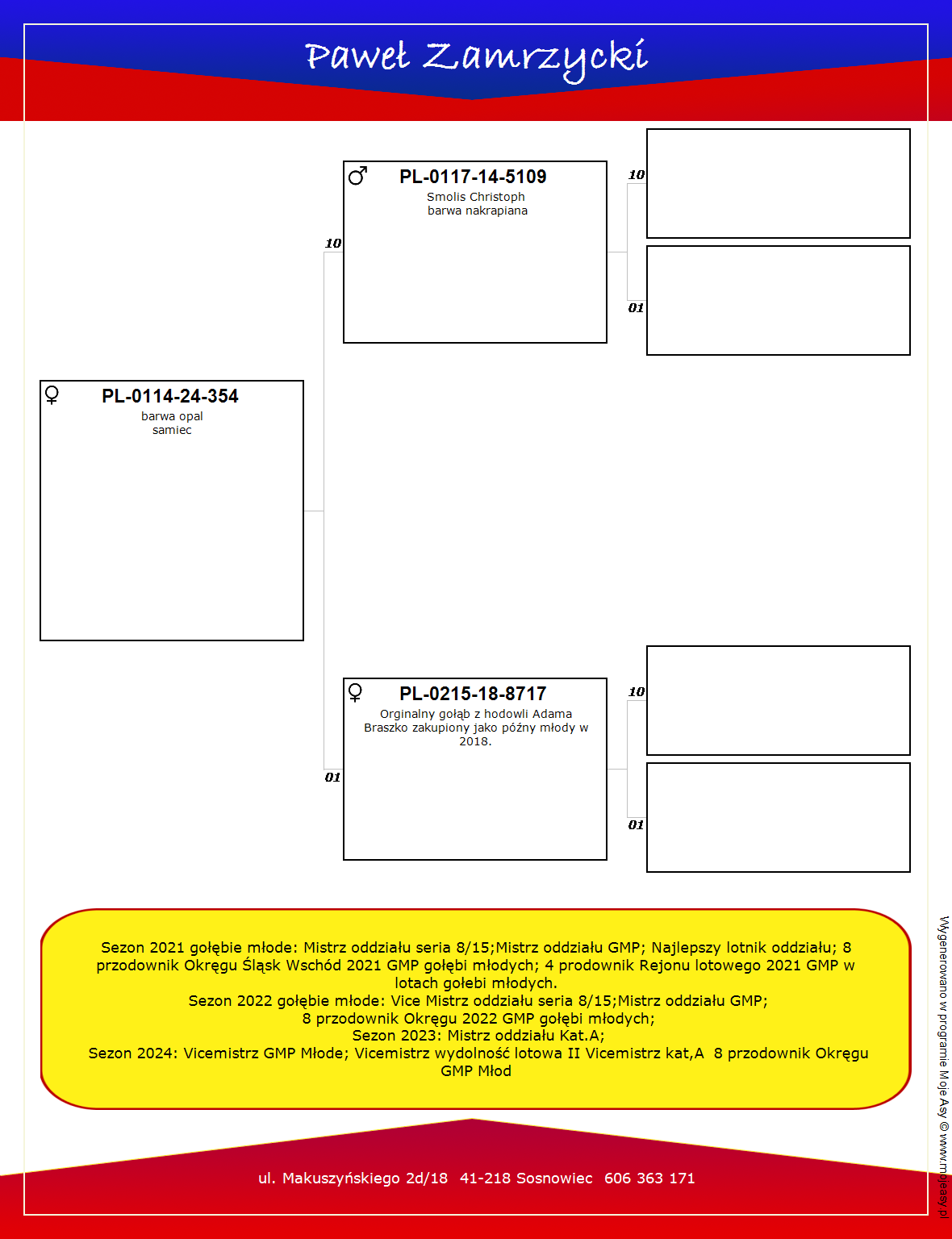 Oryginalny samiec z hodowli Pawła Zamrzyciego, z gołebi PL-0114-24-354 Braszko/Smolis. Szczegóły pochodzenia w rodowodzie. Możliwa wysyłka kurierem (szacunkowy koszt około 150 zł), odbiór osobisty lub odbiór na wystawie ogólnopolskiej. Kontakt: 606363171 Ptak po pełnej profilaktyce, zaszczepione Columba RP, przygotowany do sezonu lęgowego.