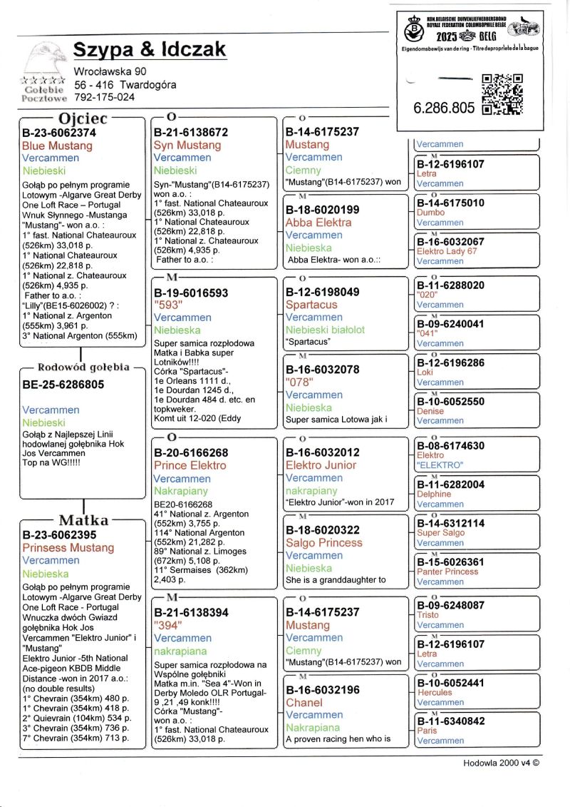 Profesjonalna hodowla z wieloletnim doświadczeniem, posiadająca w swoim stadzie materiał najwyższej światowej klasy. Więcej informacji w załączonych materiałach oraz pod nr tel. 792-175-024 Oferowany gołąb to prawdopodobnie SAMIEC. Płeć pisana orientacyjnie Wysyłka 100 zł