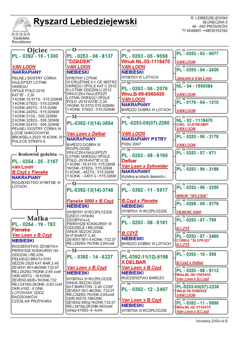 Oryginalny gołąb z hodowli Ryszarda Lebiedziejewskiego. Szczegóły pochodzenia w rodowodzie. Oferowany gołąb to prawdopodobnie samica. Więcej informacji pod nr 530 152 182. Gołębie po kuracjach przygotowane do sezonu. Transport gołębi prywatnym kurierem 130zł do 3 szt. od 4 szt. do 6 szt. 150 zł. Możliwość odbioru na Ogólnopolskiej Wystawie Gołębi Pocztowych w Katowicach, w sobotę (10.01.2026r).