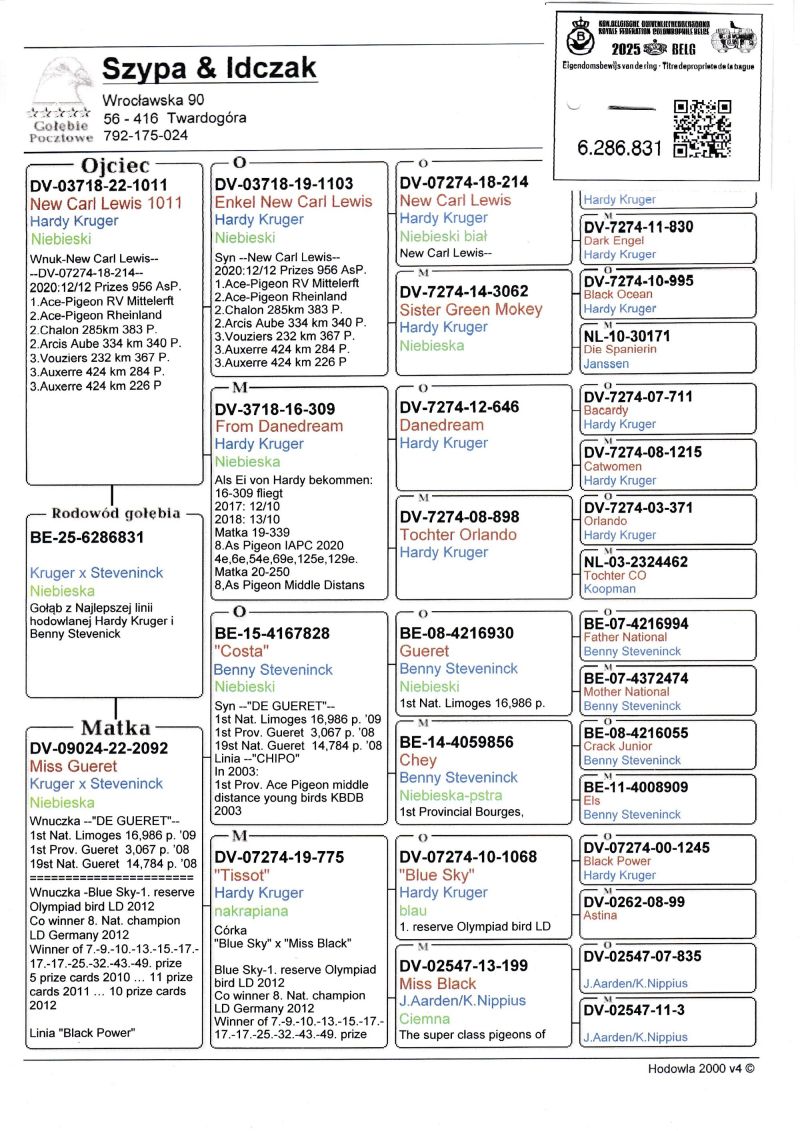 Profesjonalna hodowla z wieloletnim doświadczeniem, posiadająca w swoim stadzie materiał najwyższej światowej klasy. Więcej informacji w załączonych materiałach oraz pod nr tel. 792-175-024 Oferowany gołąb to prawdopodobnie SAMICA. Płeć pisana orientacyjnie Wysyłka 100 zł