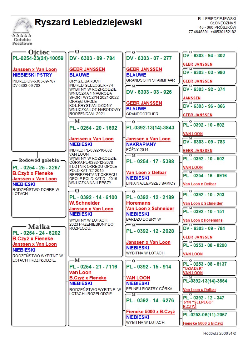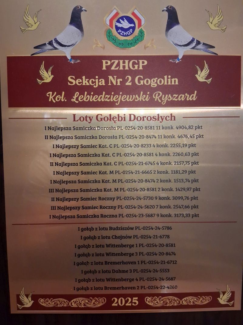 Oryginalny gołąb z hodowli Ryszarda Lebiedziejewskiego. Szczegóły pochodzenia w rodowodzie. Oferowany gołąb to prawdopodobnie samiec. Więcej informacji pod nr 530 152 182. Gołębie po kuracjach przygotowane do sezonu. Transport gołębi prywatnym kurierem 130zł do 3 szt. od 4 szt. do 6 szt. 150 zł. Możliwość odbioru na Ogólnopolskiej Wystawie Gołębi Pocztowych w Katowicach, w sobotę (10.01.2026r).