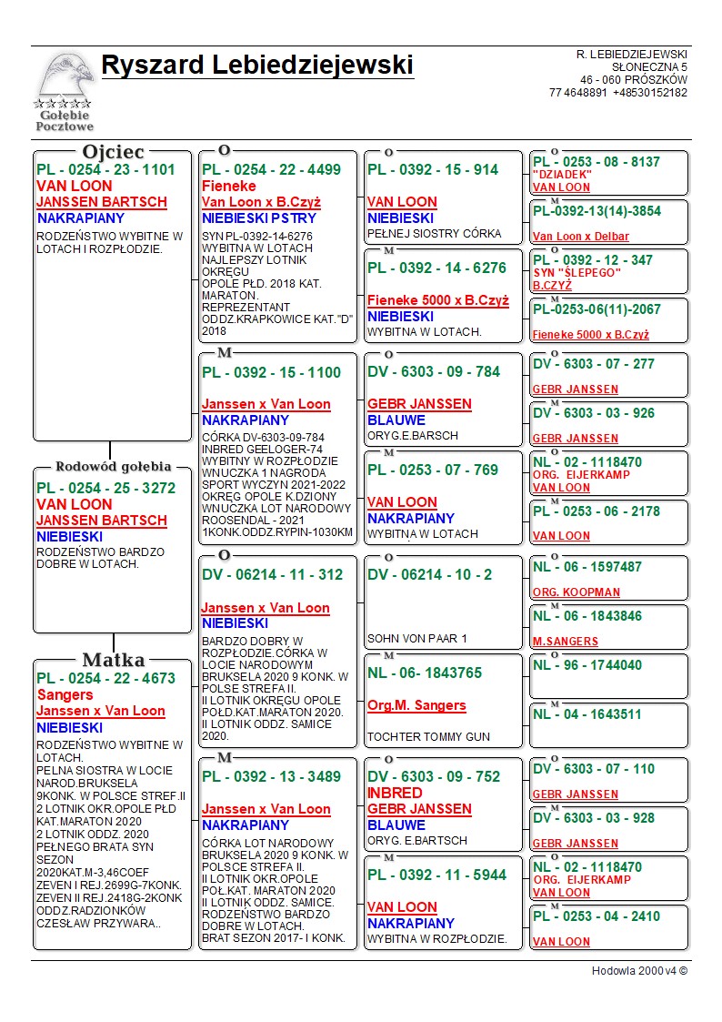 Oryginalny gołąb z hodowli Ryszarda Lebiedziejewskiego. Szczegóły pochodzenia w rodowodzie. Oferowany gołąb to prawdopodobnie samiec. Więcej informacji pod nr 530 152 182. Gołębie po kuracjach przygotowane do sezonu. Transport gołębi prywatnym kurierem 130zł do 3 szt. od 4 szt. do 6 szt. 150 zł. Możliwość odbioru na Ogólnopolskiej Wystawie Gołębi Pocztowych w Katowicach, w sobotę (10.01.2026r).