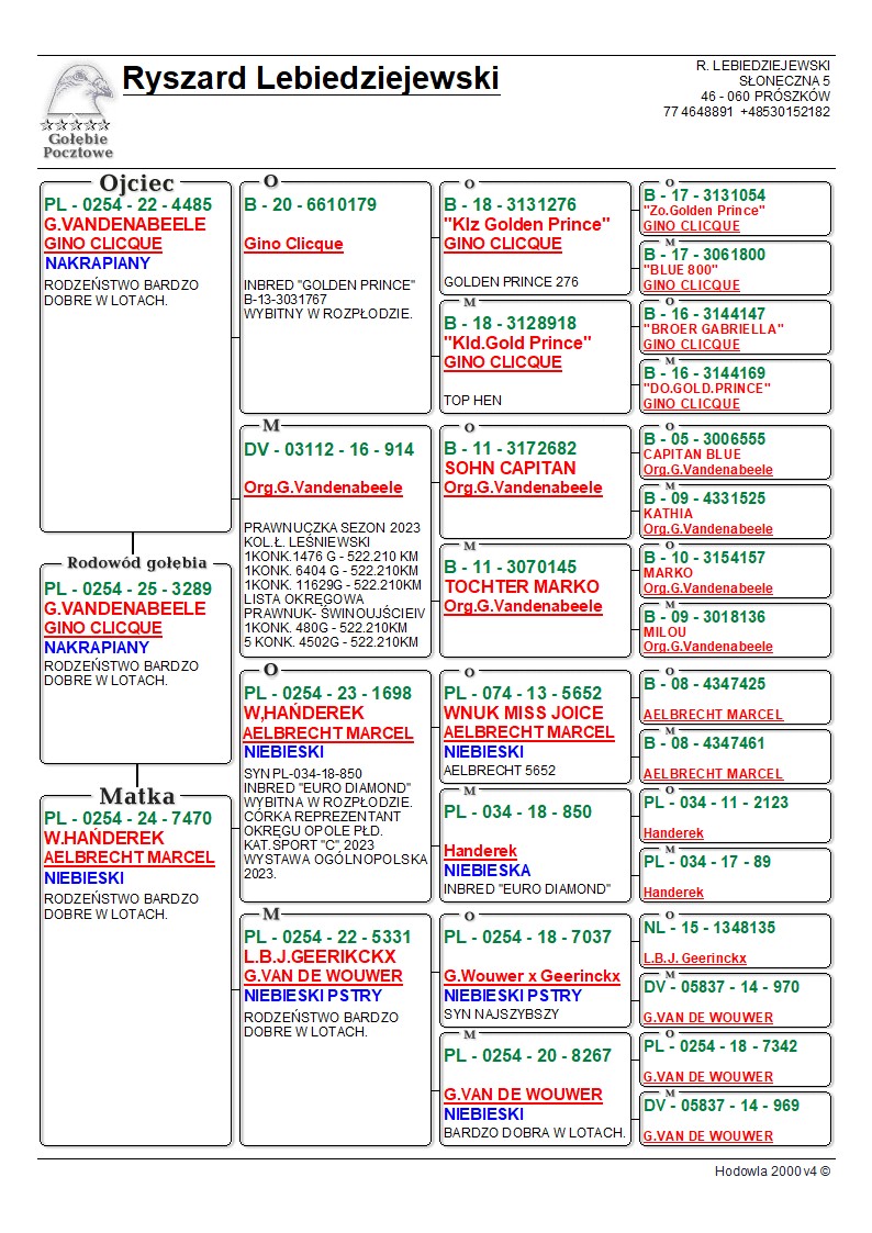 Oryginalny gołąb z hodowli Ryszarda Lebiedziejewskiego. Szczegóły pochodzenia w rodowodzie. Oferowany gołąb to prawdopodobnie samiec. Więcej informacji pod nr 530 152 182. Gołębie po kuracjach przygotowane do sezonu. Transport gołębi prywatnym kurierem 130zł do 3 szt. od 4 szt. do 6 szt. 150 zł. Możliwość odbioru na Ogólnopolskiej Wystawie Gołębi Pocztowych w Katowicach, w sobotę (10.01.2026r).