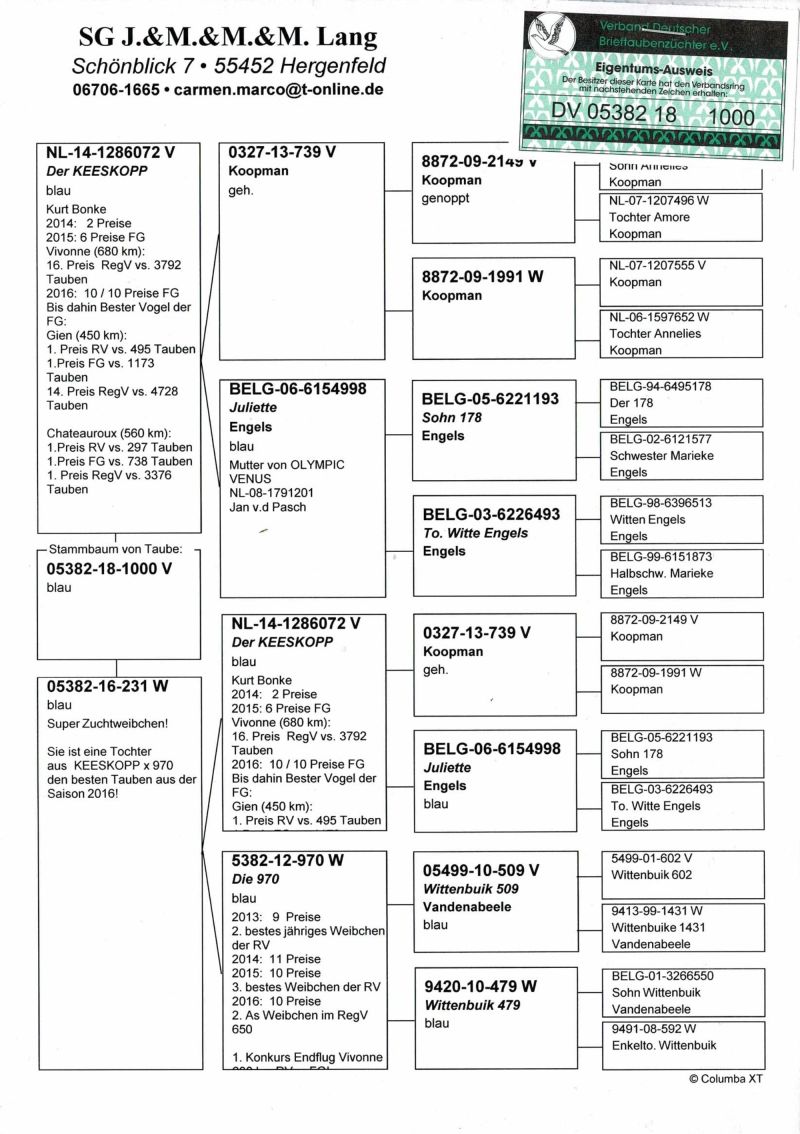 Oryginalny gołąb z hodowli - SG J.&M.&M.&M. Lang. Więcej informacji w rodowodzie oraz pod numerem telefonu: +48 515 143 940