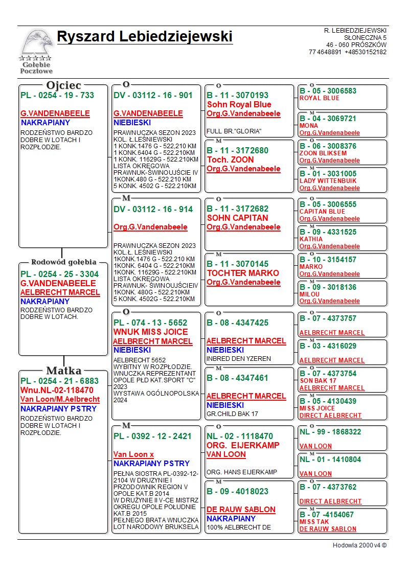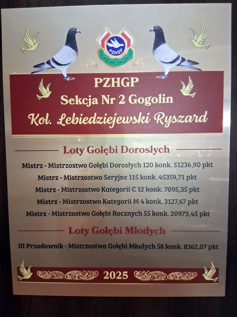 Oryginalny gołąb z hodowli Ryszarda Lebiedziejewskiego. Szczegóły pochodzenia w rodowodzie. Oferowany gołąb to prawdopodobnie samica. Więcej informacji pod nr 530 152 182. Gołębie po kuracjach przygotowane do sezonu. Transport gołębi prywatnym kurierem 130zł do 3 szt. od 4 szt. do 6 szt. 150 zł. Możliwość odbioru na Ogólnopolskiej Wystawie Gołębi Pocztowych w Katowicach, w sobotę (10.01.2026r).