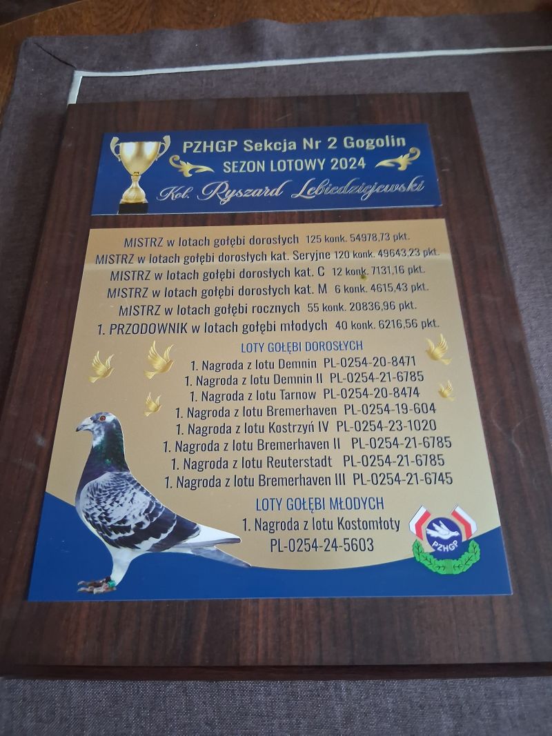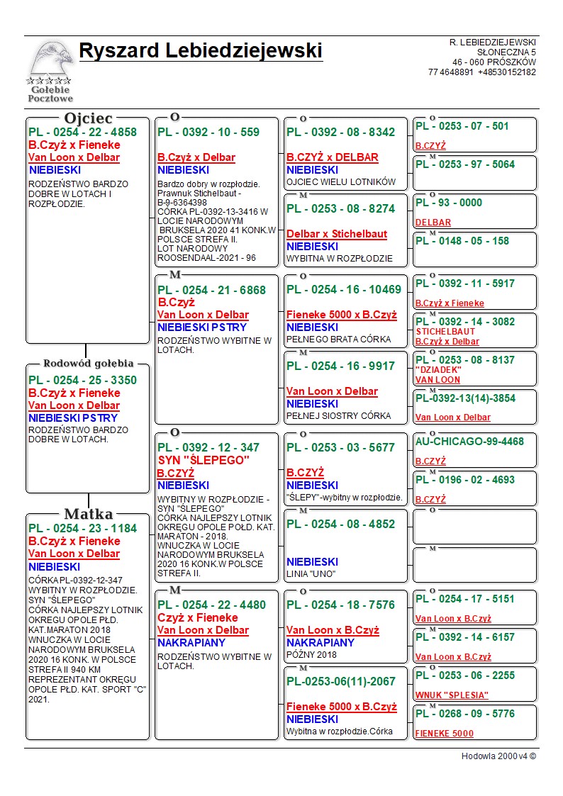 Oryginalny gołąb z hodowli Ryszarda Lebiedziejewskiego. Szczegóły pochodzenia w rodowodzie. Oferowany gołąb to prawdopodobnie samica. Więcej informacji pod nr 530 152 182. Gołębie po kuracjach przygotowane do sezonu. Transport gołębi prywatnym kurierem 130zł do 3 szt. od 4 szt. do 6 szt. 150 zł. Możliwość odbioru na Ogólnopolskiej Wystawie Gołębi Pocztowych w Katowicach, w sobotę (10.01.2026r).