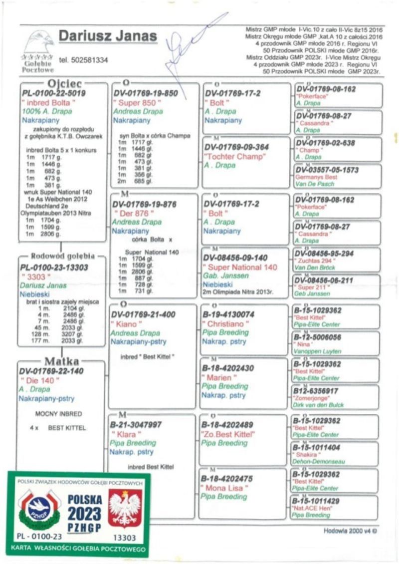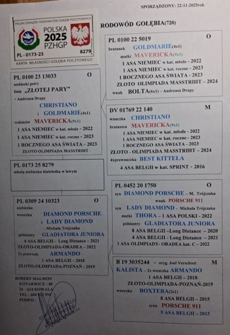 Płeć: młody gołąb Hodowca - rasa: Robert Malmon - PEC/Drapa/Trójczak/Verschoot Zakończenie: 7.01.2026 godz. 17:32