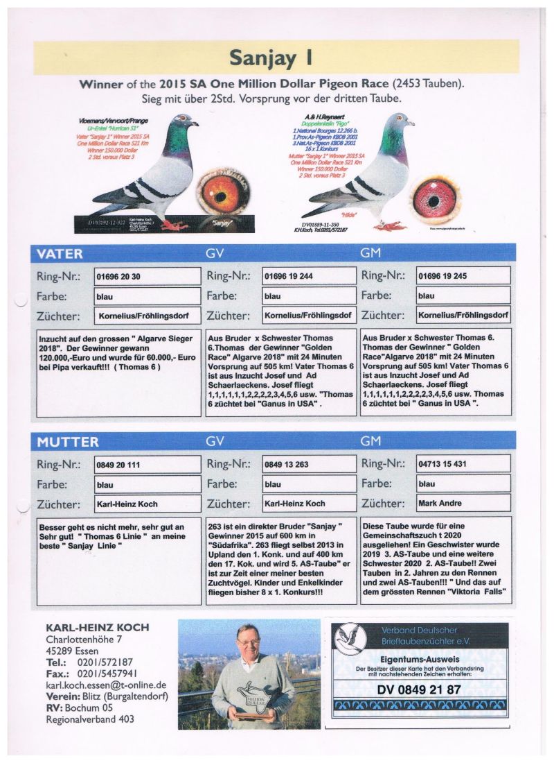 ***** UWAGA ***** !!!!! Możliwy odbiór osobisty lub dostawa realizowana przez kuriera w cenie 160 zł !!!!! **** <<<< Możliwy także odbiór na wystawie Ogólnopolskiej w Katowicach (sobota lub niedziela). UZGODNIENIE TELEFONICZNE >>>> **** !!!!! Oryginalny gołąb z hodowli KARL-HEINZ KOCH. Szczegóły pochodzenia w rodowodzie. Gołąb gotowy do sezonu lęgowego, zaszczepiony przeciwko paramyksowirozie (Columba) i salmonellozie (Salmo PT). Więcej informacji pod nr tel.: 669 404 144. Wpłata za gołębia na konto po zakończeniu aukcji. Możliwy odbiór osobisty lub dostawa realizowana przez kuriera w cenie 160 zł. Możliwy także odbiór na wystawie Ogólnopolskiej w Katowicach (sobota lub niedziela).