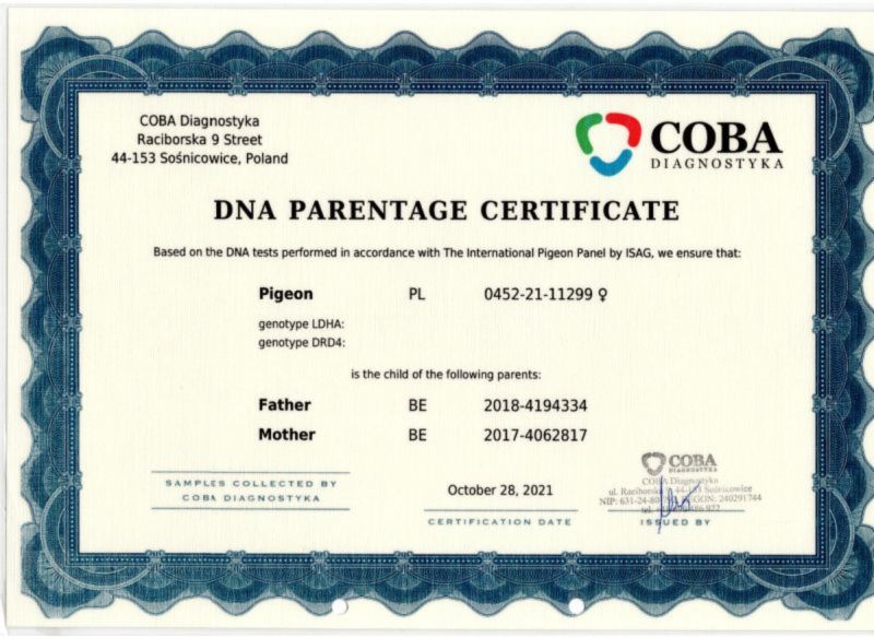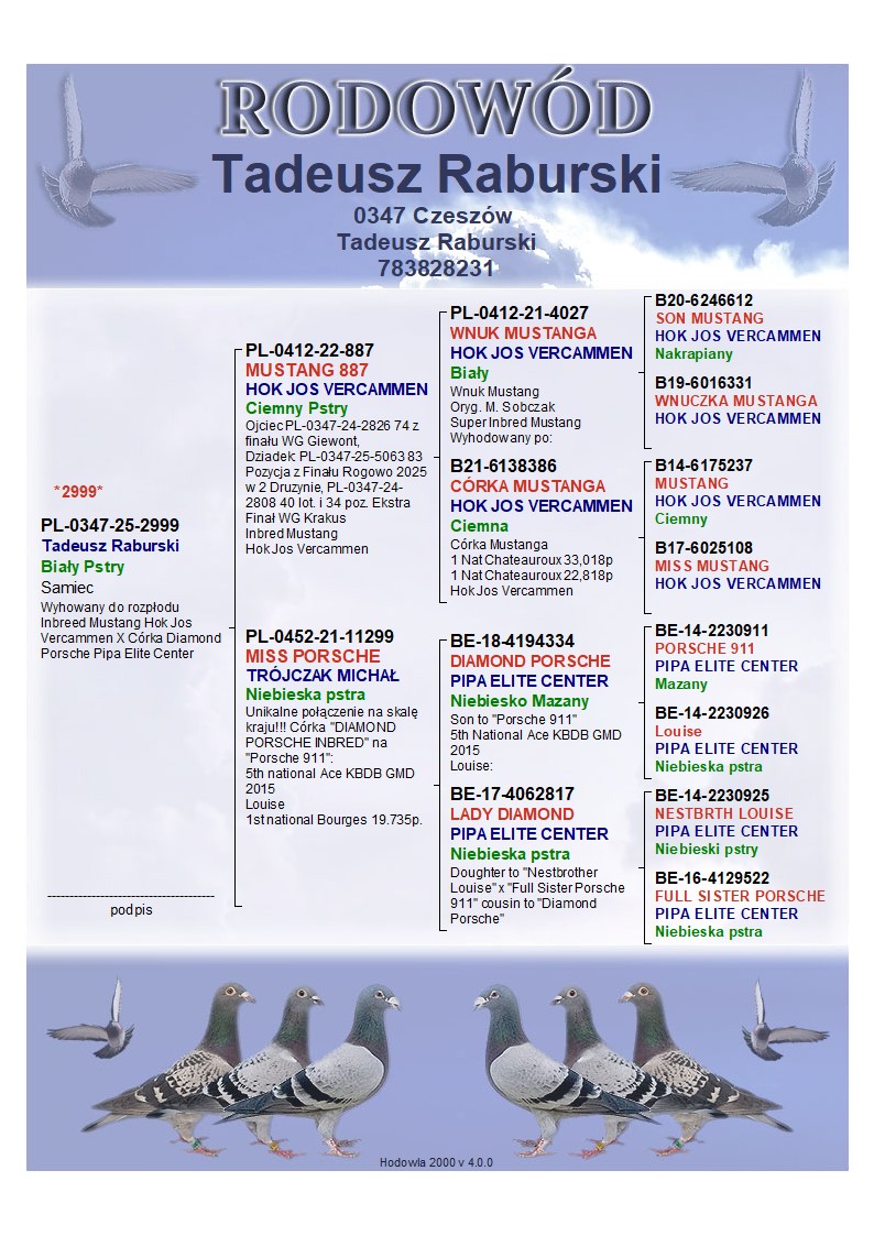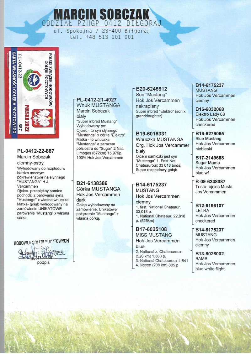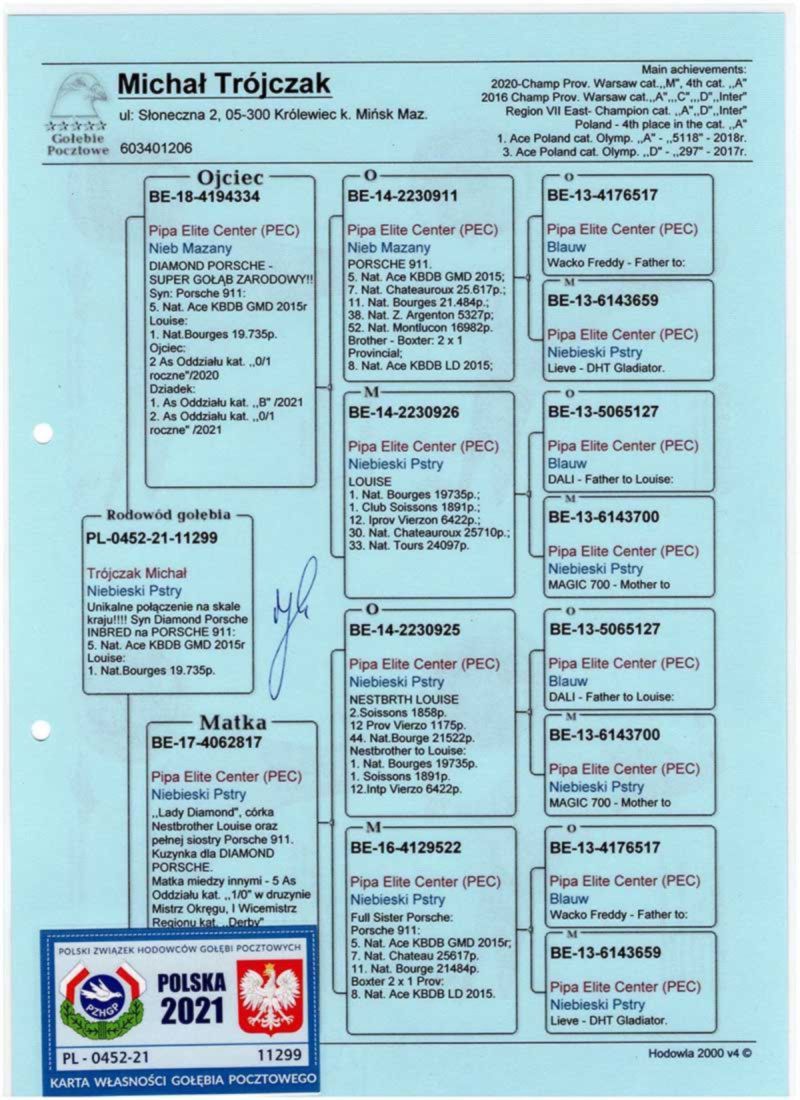 Hodowla skupiona w lotach gołębi na wspólnych gołębnikach z wieloma sukcesami. Zaprasza Państwa do licytacji wartościowego materiału do dalszej hodowli. Proponowany gołąb to syn "887" a zarazem wnuk DIAMOND PORSCHE matka z certyfikatem DNA. Wielu kuzynów osiąga sukcesy na wspólnych gołębnikach. Więcej informacji w rodowodzie oraz pod nr. tel. WYSYŁKA PRYWATNYM KURIEREM LUB ODBIÓR OSOBISTY.