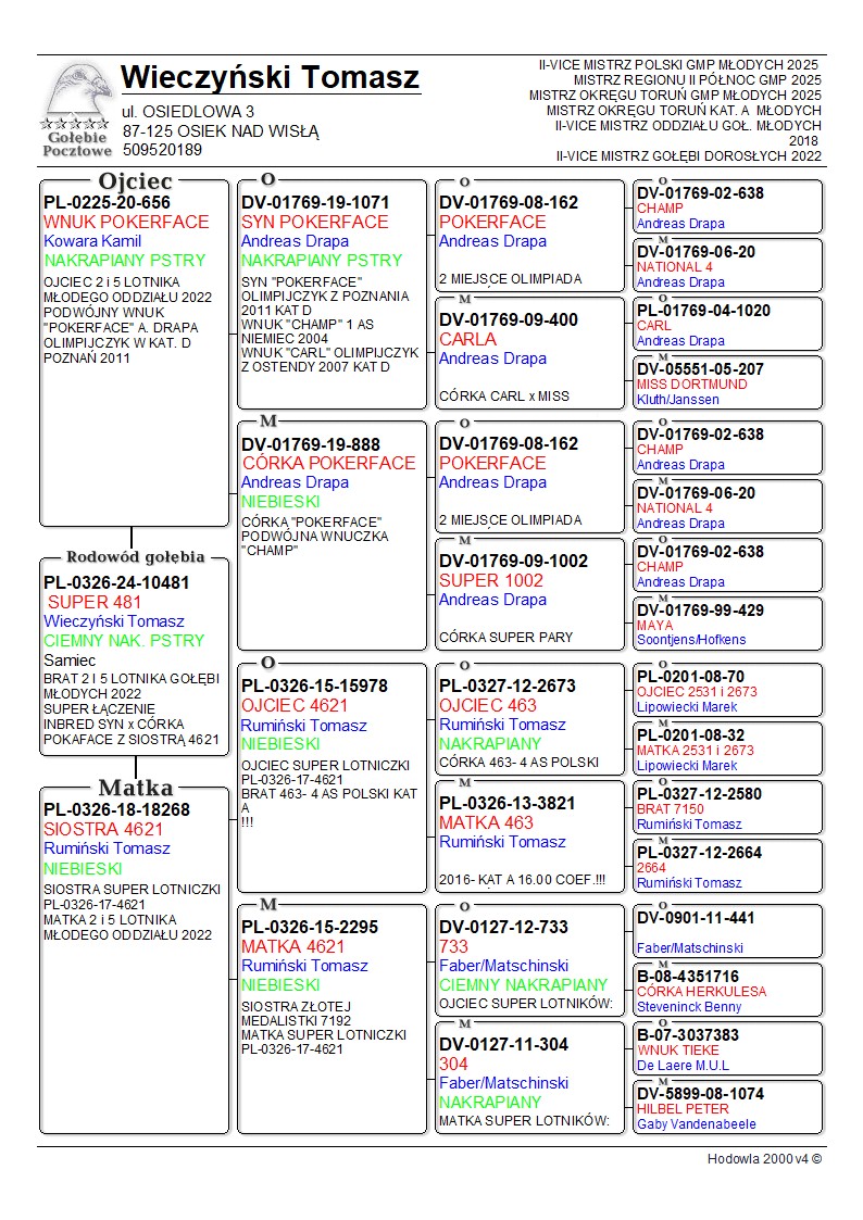 oryg. Tomasz Wieczyński Szczegóły pochodzenia w rodowodzie. Odbiór gołębia osobisty, transport kurierem lub odbiór podczas wystawy ogólnopolskiej piątek, sobota, niedziela. Więcej informacji pod nr tel.: 509 520 189.
