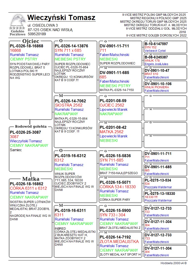 oryg. Tomasz Wieczyński Szczegóły pochodzenia w rodowodzie. Odbiór gołębia osobisty, transport kurierem lub odbiór podczas wystawy ogólnopolskiej piątek, sobota, niedziela. Więcej informacji pod nr tel.: 509 520 189.