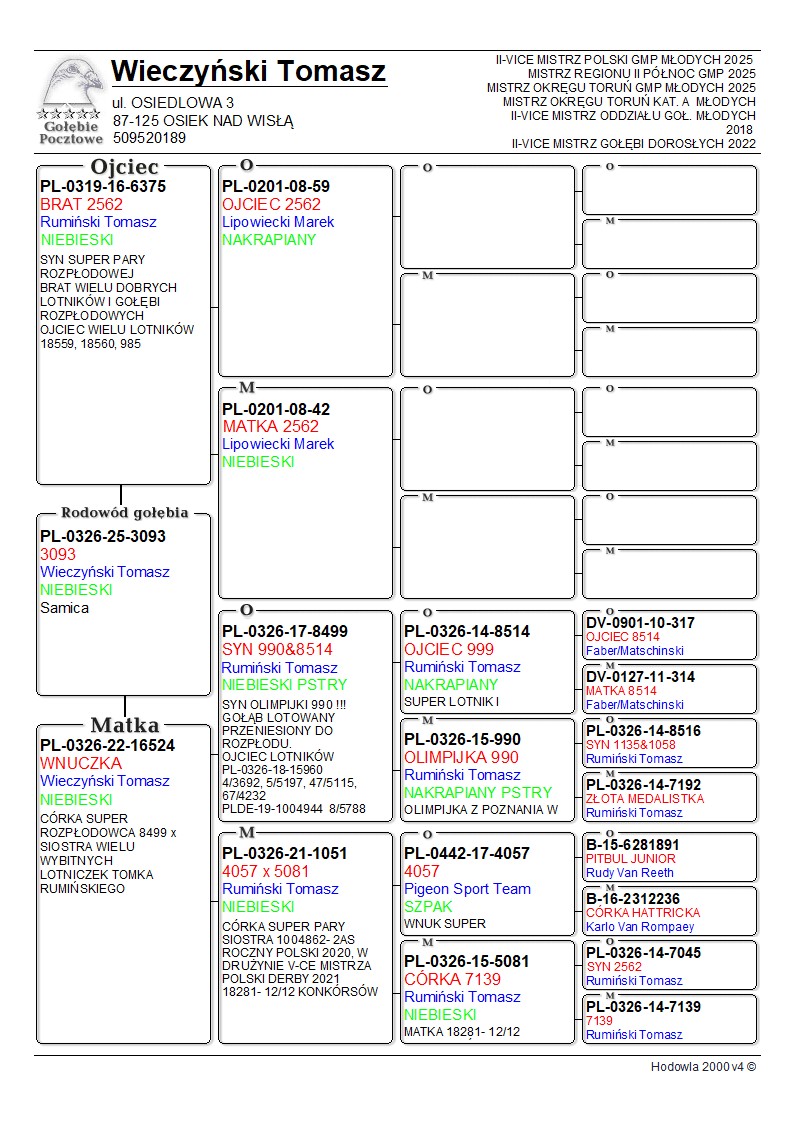 oryg. Tomasz Wieczyński Szczegóły pochodzenia w rodowodzie. Odbiór gołębia osobisty, transport kurierem lub odbiór podczas wystawy ogólnopolskiej piątek, sobota, niedziela. Więcej informacji pod nr tel.: 509 520 189.