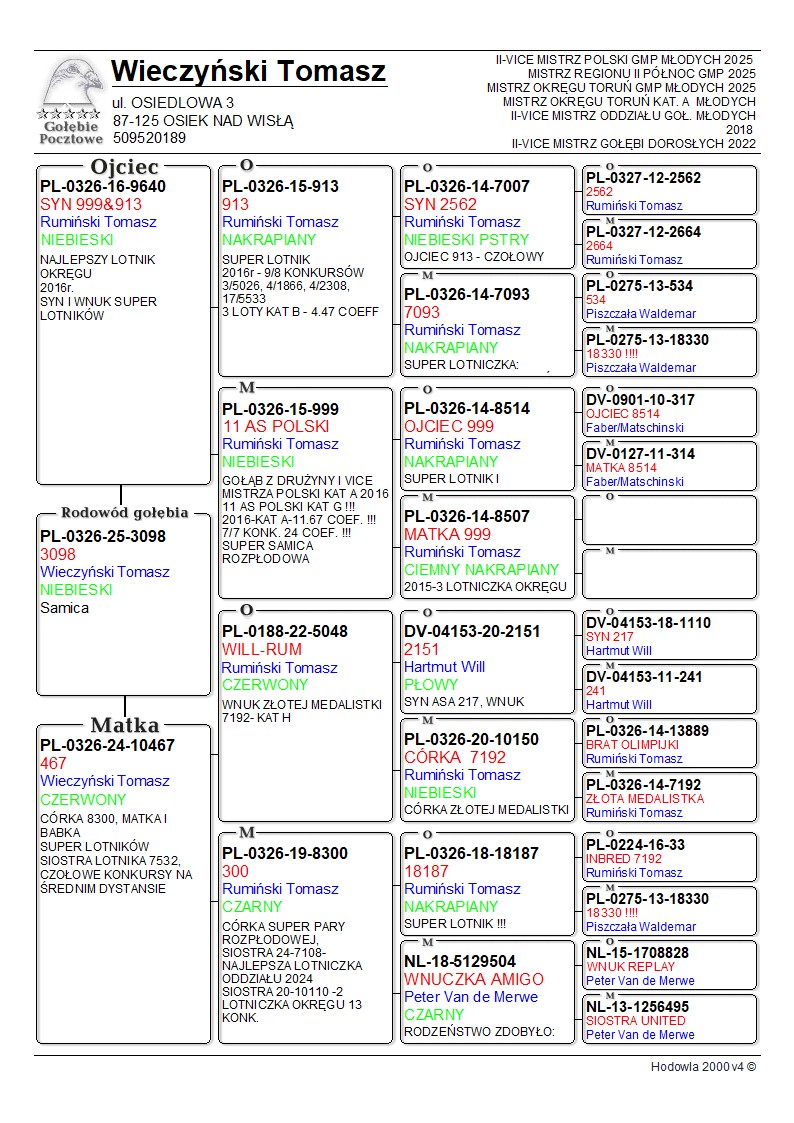 oryg. Tomasz Wieczyński Szczegóły pochodzenia w rodowodzie. Odbiór gołębia osobisty, transport kurierem lub odbiór podczas wystawy ogólnopolskiej piątek, sobota, niedziela. Więcej informacji pod nr tel.: 509 520 189.