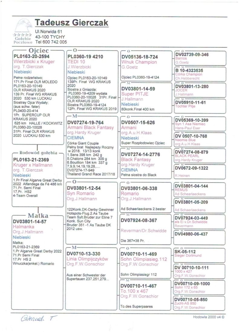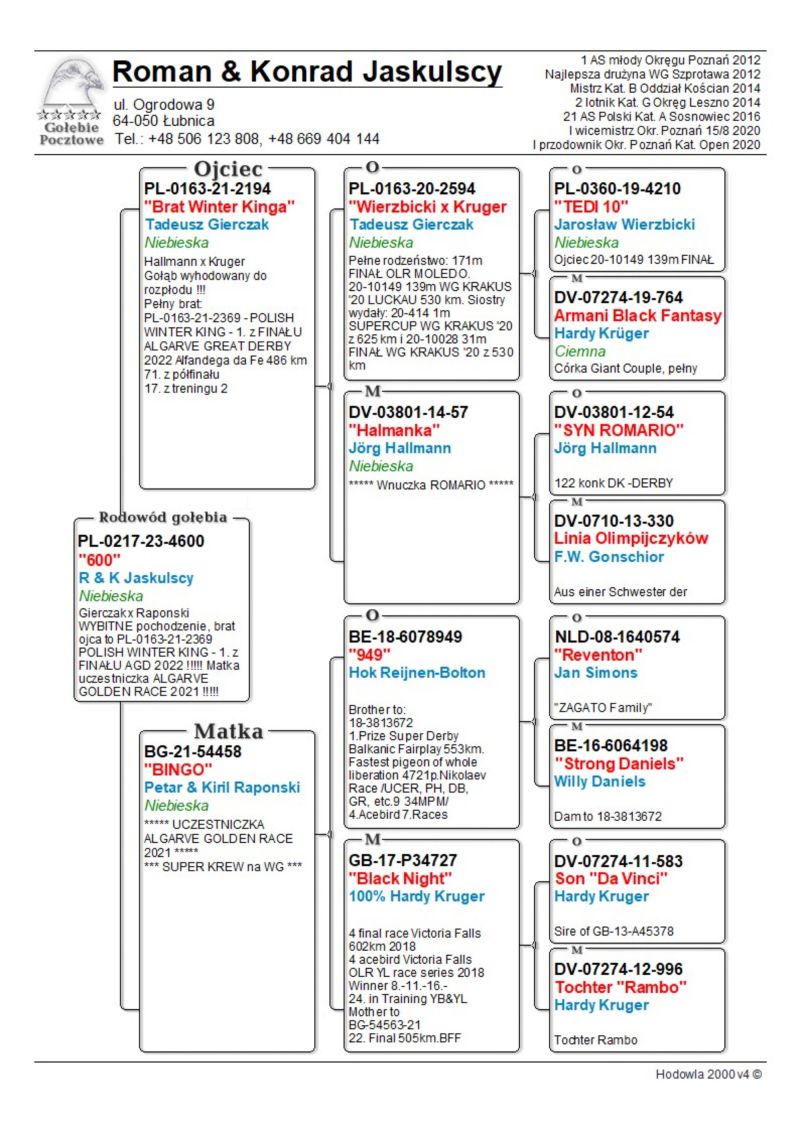 ***** UWAGA ***** !!!!! Możliwy odbiór osobisty lub dostawa realizowana przez kuriera w cenie 160 zł !!!!! **** <<<< Możliwy także odbiór na wystawie Ogólnopolskiej w Katowicach (sobota lub niedziela). UZGODNIENIE TELEFONICZNE >>>> **** !!!!! Oryginalny gołąb z hodowli Romana & Konrada Jaskulskich. Szczegóły pochodzenia w rodowodzie. Gołąb gotowy do sezonu lęgowego, zaszczepiony przeciwko paramyksowirozie (Columba) i salmonellozie (Salmo PT). Więcej informacji pod nr tel.: 669 404 144. Wpłata za gołębia na konto po zakończeniu aukcji. Możliwy odbiór osobisty lub dostawa realizowana przez kuriera w cenie 160 zł. Możliwy także odbiór na wystawie Ogólnopolskiej w Katowicach (sobota lub niedziela).