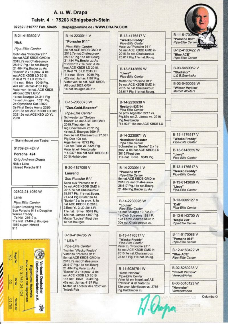 Hodowla skupiona w lotach gołębi na wspólnych gołębnikach z wieloma sukcesami. Zaprasza Państwa do licytacji wartościowego materiału do dalszej hodowli. Proponowany gołąb to wnuk Porsche 911 A. Drapa x siostra 2808 matki 16 As/4058g. MWG Rogowo. Linia moich bazowych par rozpłodowych, wielu kuzynów osiąga sukcesy na wspólnych gołębnikach, i nie tylko. Więcej informacji w rodowodzie oraz pod nr. tel. WYSYŁKA PRYWATNYM KURIEREM LUB ODBIÓR OSOBISTY, LUB ODBIÓR NA WYSTAWIE OGÓLNOPOLSKIEJ