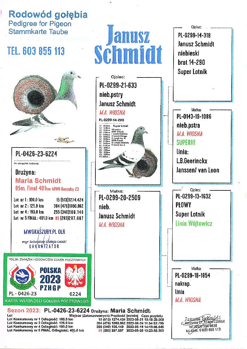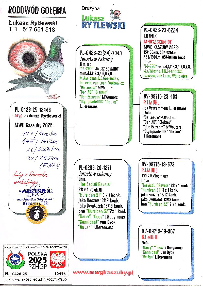 Gołąb (32 MIEJSCE z lotu Finałowego) brał udział w zawodach na Wspólnym Gołębniku KASZUBY. Więcej informacji w rodowodzie i załącznikach. Kontakt do Właściciela Gołębnika tel.601686344 (Sebastian Ostoja-Lniski). Informujemy poza tym, że rozpoczęły się zapisy na sezon 2026. Serdecznie zapraszam do rywalizacji..... Uwaga! Koszty związane z transportem pokrywa nabywca gołębia. W zależności od kuriera wynoszą one około 150zł lub odbiór na Wystawie w Katowicach (w sobotę około 50zł). Można również odebrać gołębia osobiście. Powyżej sylwetki gołębia znajduje się video z jego prezentacją.