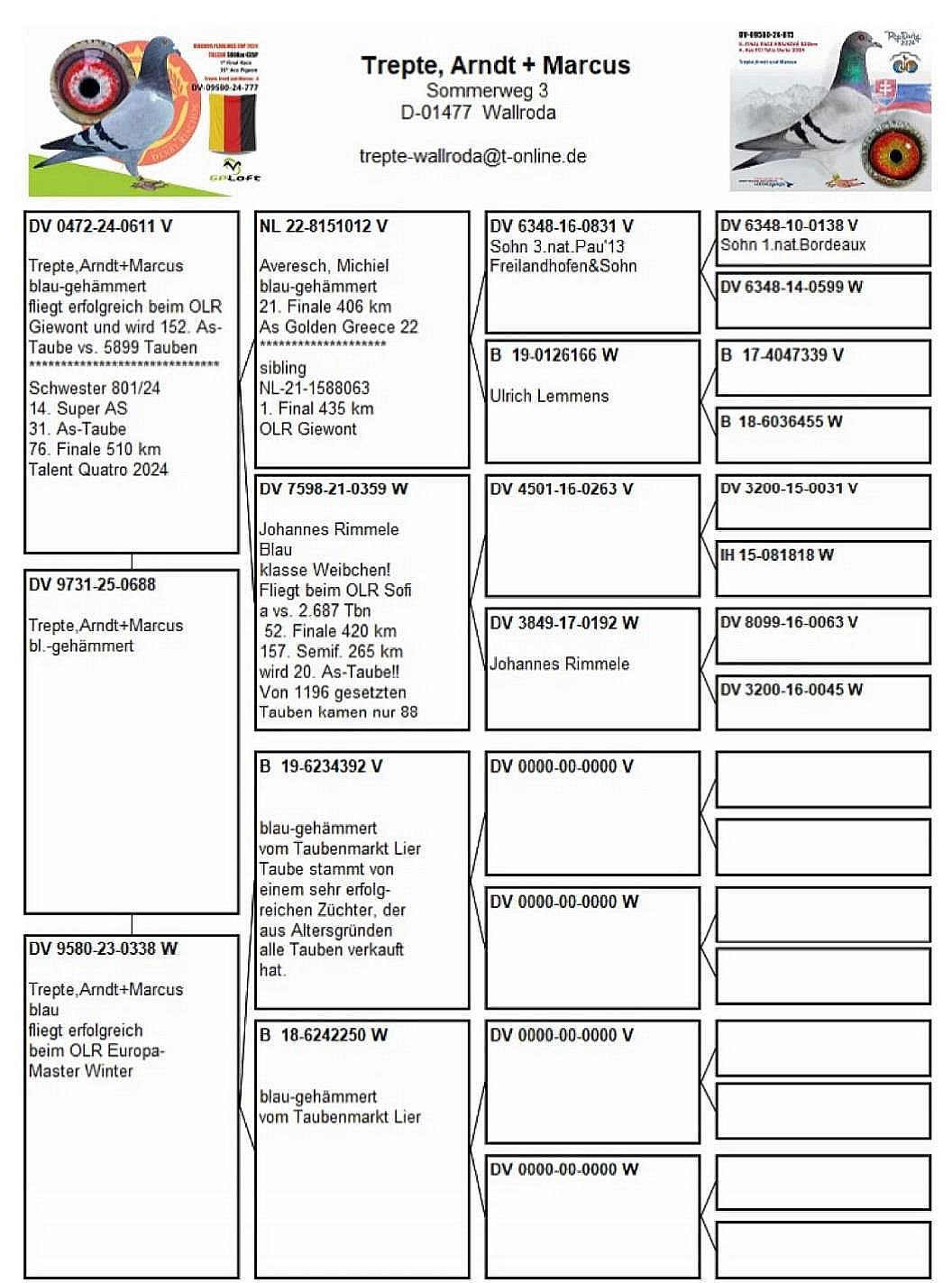 oryg. Trepte Arndt & Marcus, uczestnik MWG Giewont 2025 Szczegóły pochodzenia w rodowodzie i załączonych materiałach. Więcej informacji o gołębiu pod nr tel.: 602 106 909.