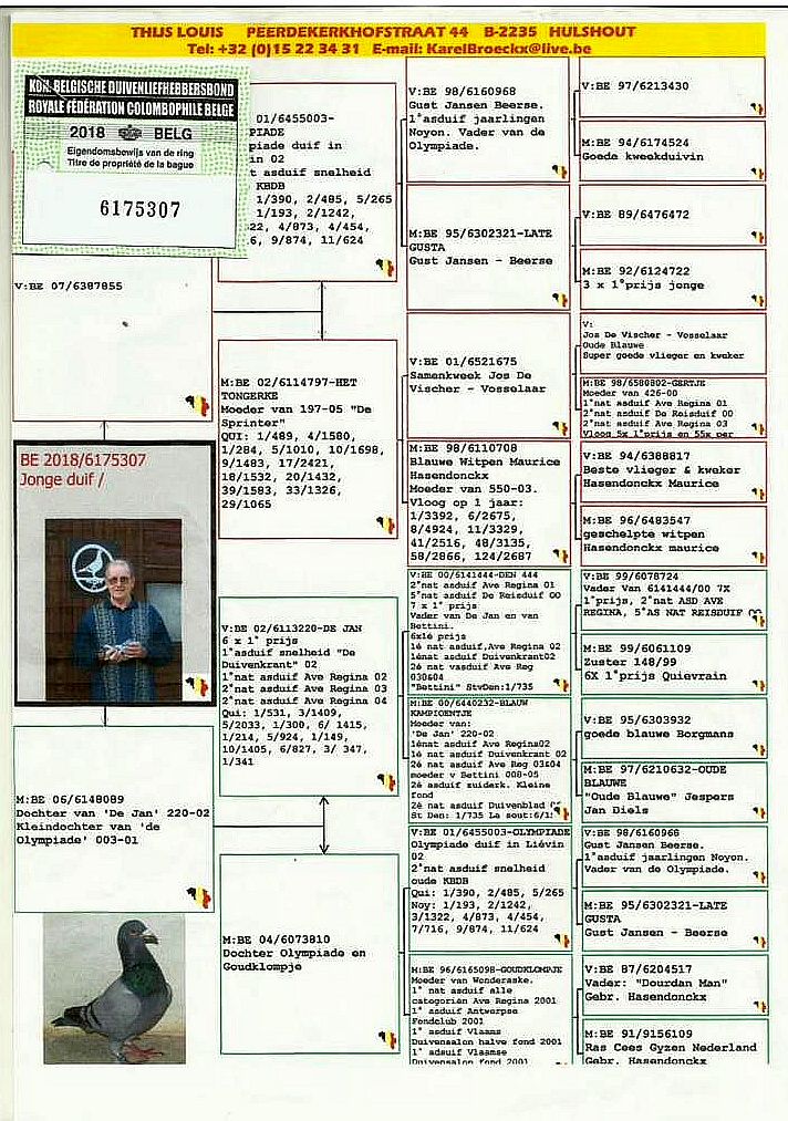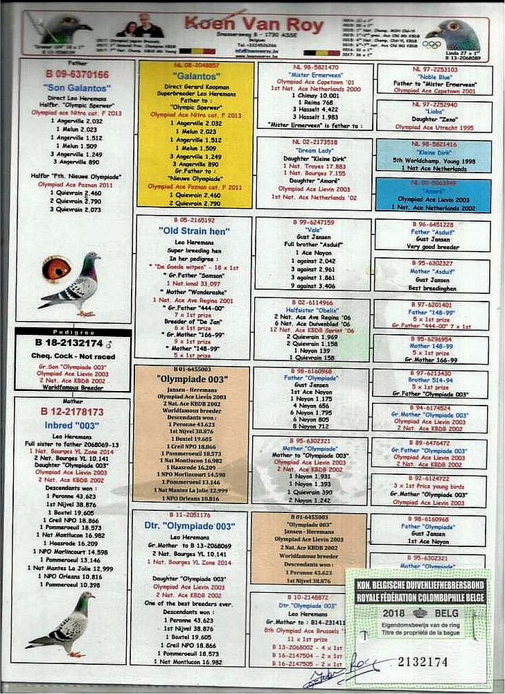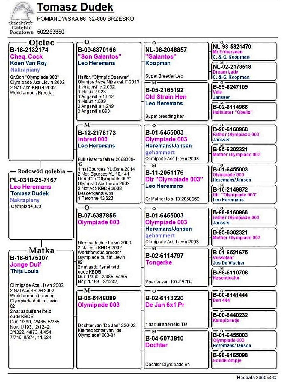 oryg. Tomasz Dudek (100% Heremans), inbred "Olympiade 003" - prawdopodobnie samica. Szczegóły pochodzenia w rodowodzie i załączonych materiałach. Więcej informacji o gołębiu pod nr tel.: 602 106 909.