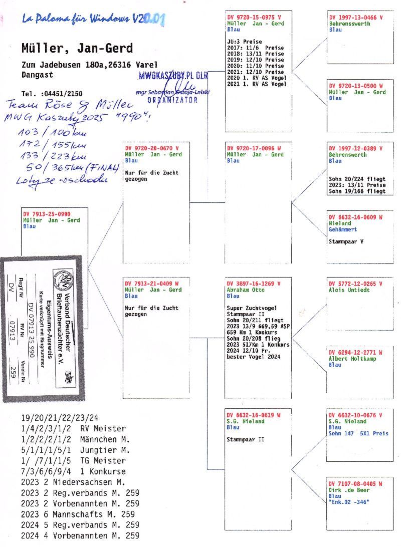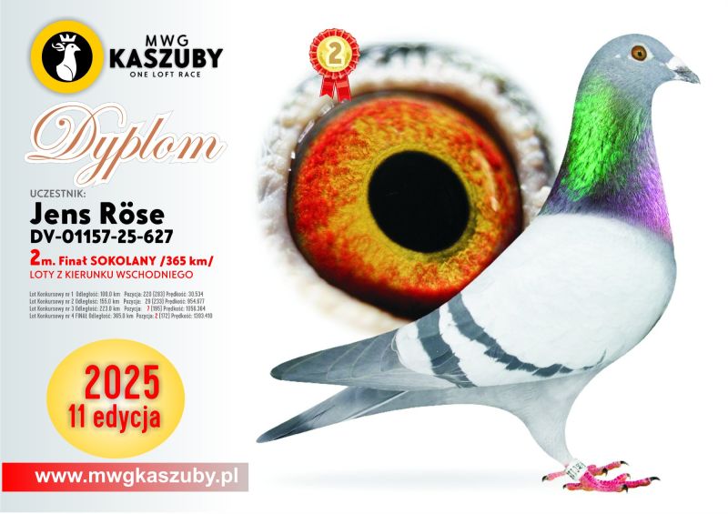 Gołąb (50 MIEJSCE z lotu Finałowego) brał udział w zawodach na Wspólnym Gołębniku KASZUBY. Więcej informacji w rodowodzie i załącznikach. Kontakt do Właściciela Gołębnika tel.601686344 (Sebastian Ostoja-Lniski). Informujemy poza tym, że rozpoczęły się zapisy na sezon 2026. Serdecznie zapraszam do rywalizacji..... Uwaga! Koszty związane z transportem pokrywa nabywca gołębia. W zależności od kuriera wynoszą one około 150zł lub odbiór na Wystawie w Katowicach (w sobotę około 50zł). Można również odebrać gołębia osobiście. Powyżej sylwetki gołębia znajduje się video z jego prezentacją.