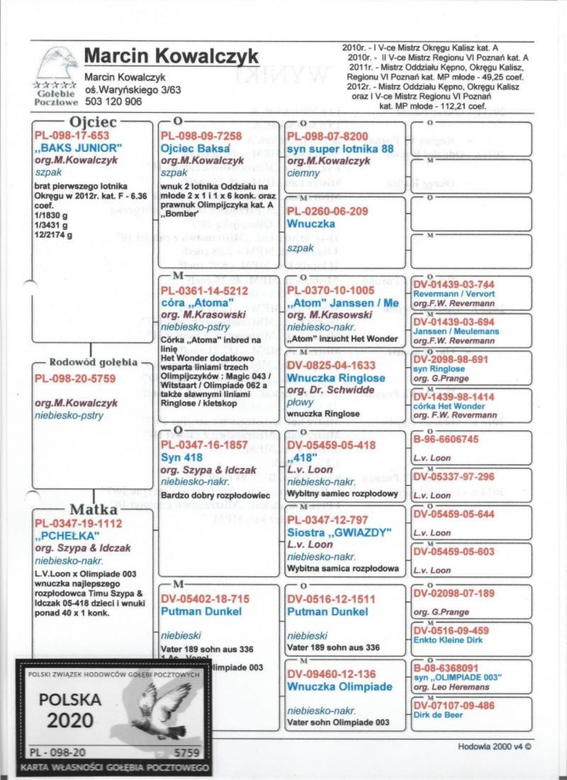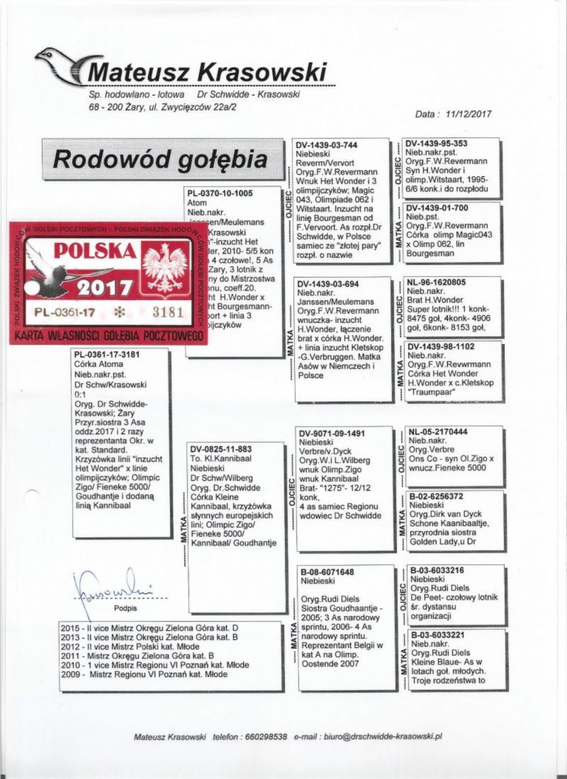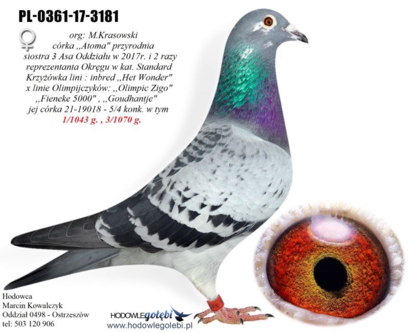 Oryginalny gołąb z hodowli Marcin Kowalczyk.# Szczegóły pochodzenia w rodowodzie. # Gołąb zaszczepiony przeciw Paramyxowirozie, Herpeswirus, Adenowirus , Ospa. # Więcej informacji pod nr tel. 503 120 906 # Możliwy transport koszt 1-3 szt. 120 zł , 3-6 szt. 140 zł # MOŻLIWY ODBIÓR NA WYSTAWIE W KATOWICACH (sobota) prawdopodobnie SAMIEC