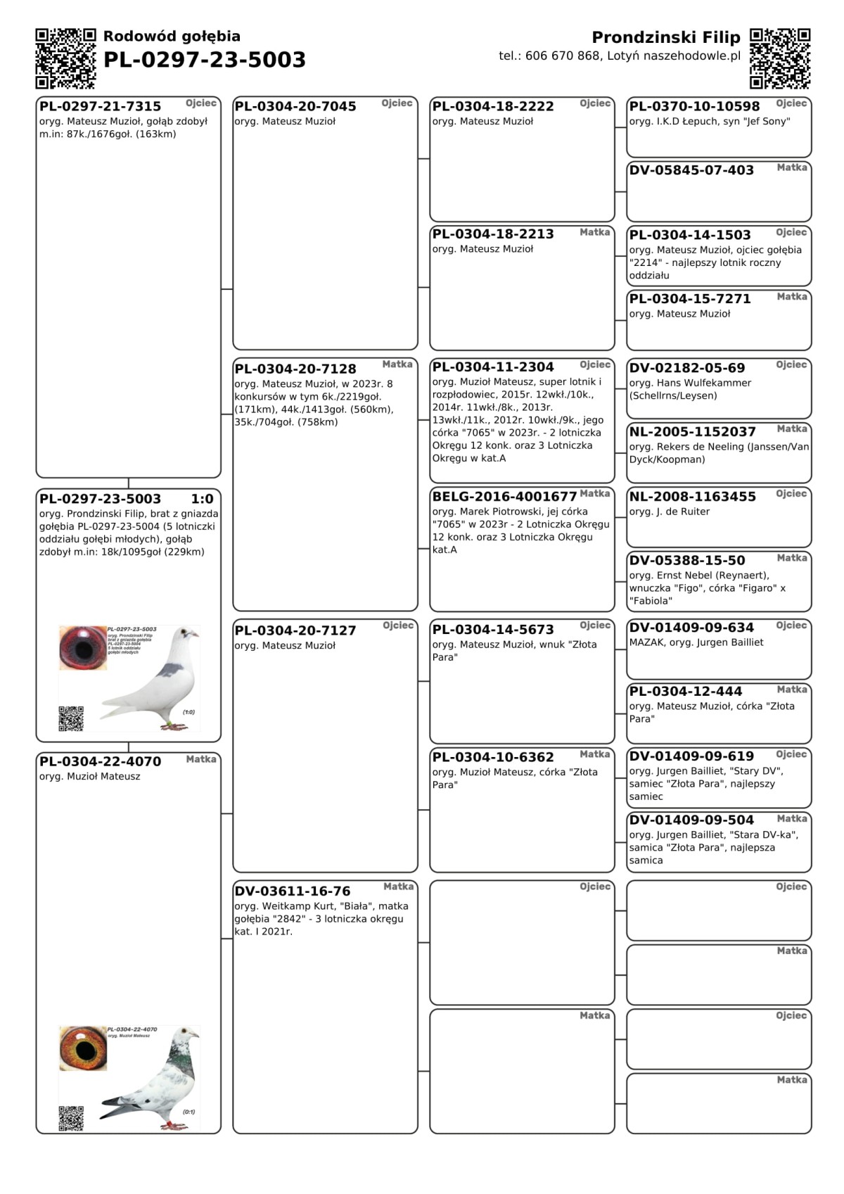 oryg. Prondzinski Filip, brat z gniazda gołębia PL-0297-23-5004 (5 lotniczki oddziału gołębi młodych), gołąb zdobył m.in: 18k/1095goł (229km) Szczegóły pochodzenia w rodowodzie i załączonych materiałach. Więcej informacji o gołębiach i transporcie pod nr tel.: 606 670 868.