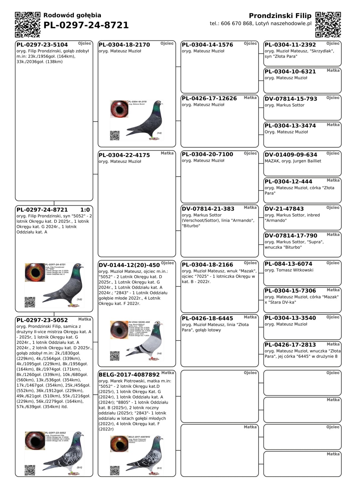 oryg. Filip Prondzinski, syn "5052" - 2 lotnik Okręgu kat. D 2025r., 1 lotnik Okręgu kat. G 2024r., 1 lotnik Oddziału kat. A Szczegóły pochodzenia w rodowodzie i załączonych materiałach. Więcej informacji o gołębiach i transporcie pod nr tel.: 606 670 868.
