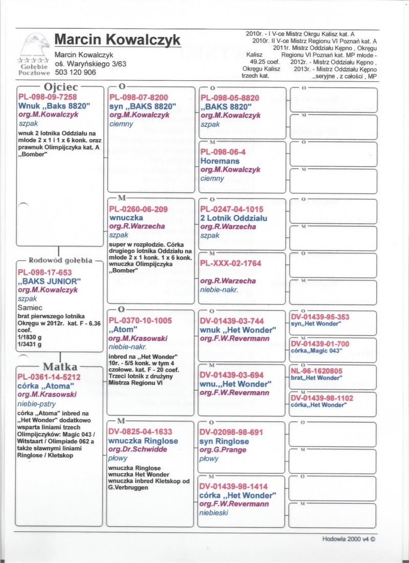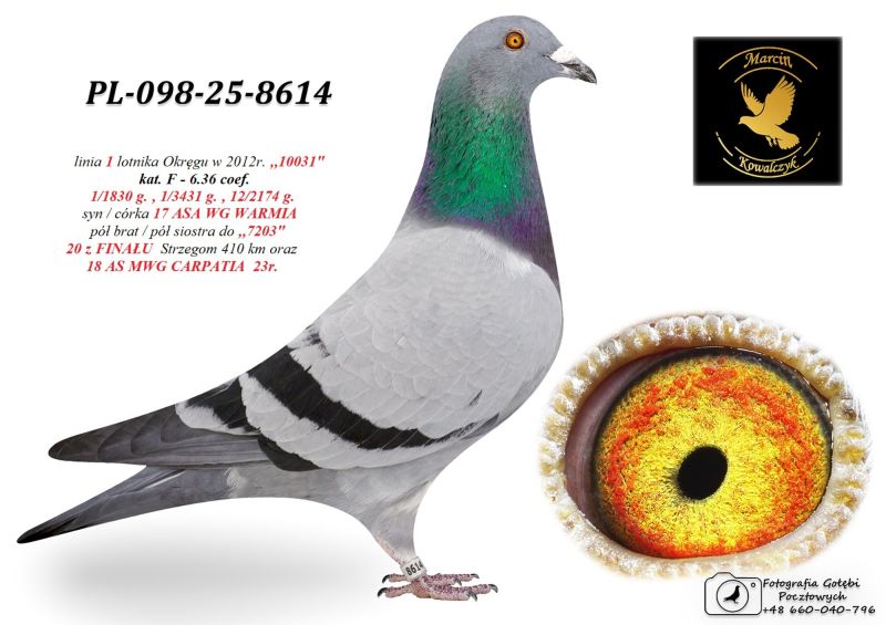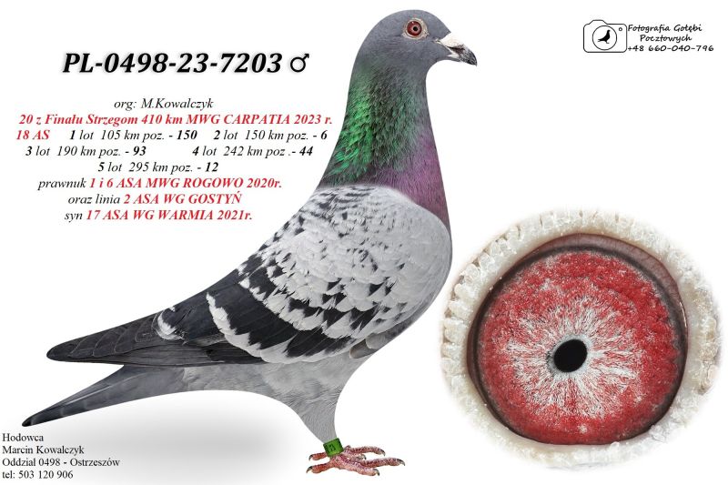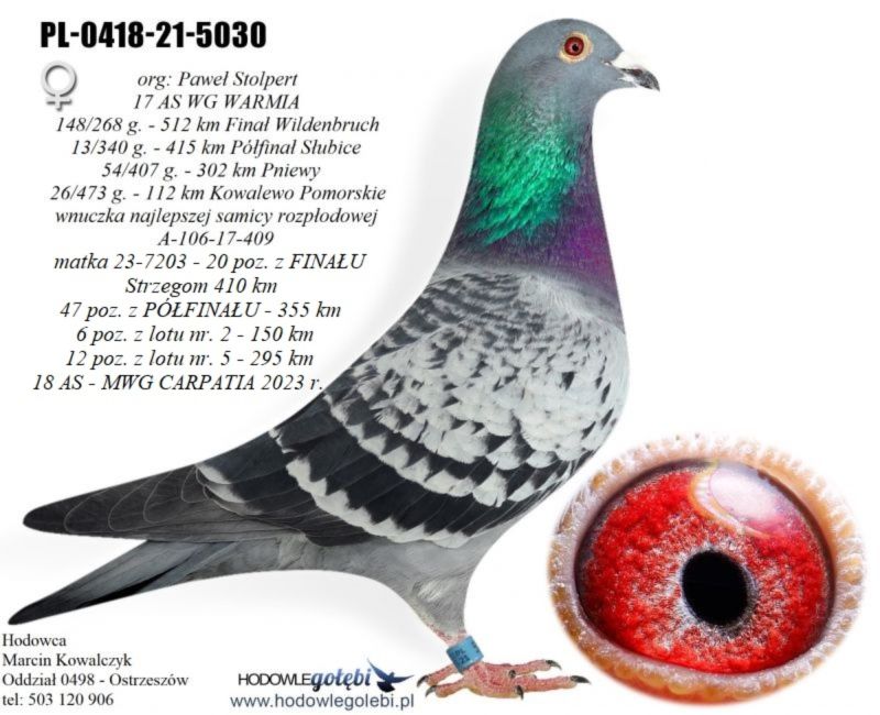 Oryginalny gołąb z hodowli Marcin Kowalczyk.# Szczegóły pochodzenia w rodowodzie. # Gołąb zaszczepiony przeciw Paramyxowirozie, Herpeswirus, Adenowirus , Ospa. # Więcej informacji pod nr tel. 503 120 906 # Możliwy transport koszt 1-3 szt. 120 zł , 3-6 szt. 140 zł # MOŻLIWY ODBIÓR NA WYSTAWIE W KATOWICACH (sobota)prawdopodobnie SAMIEC