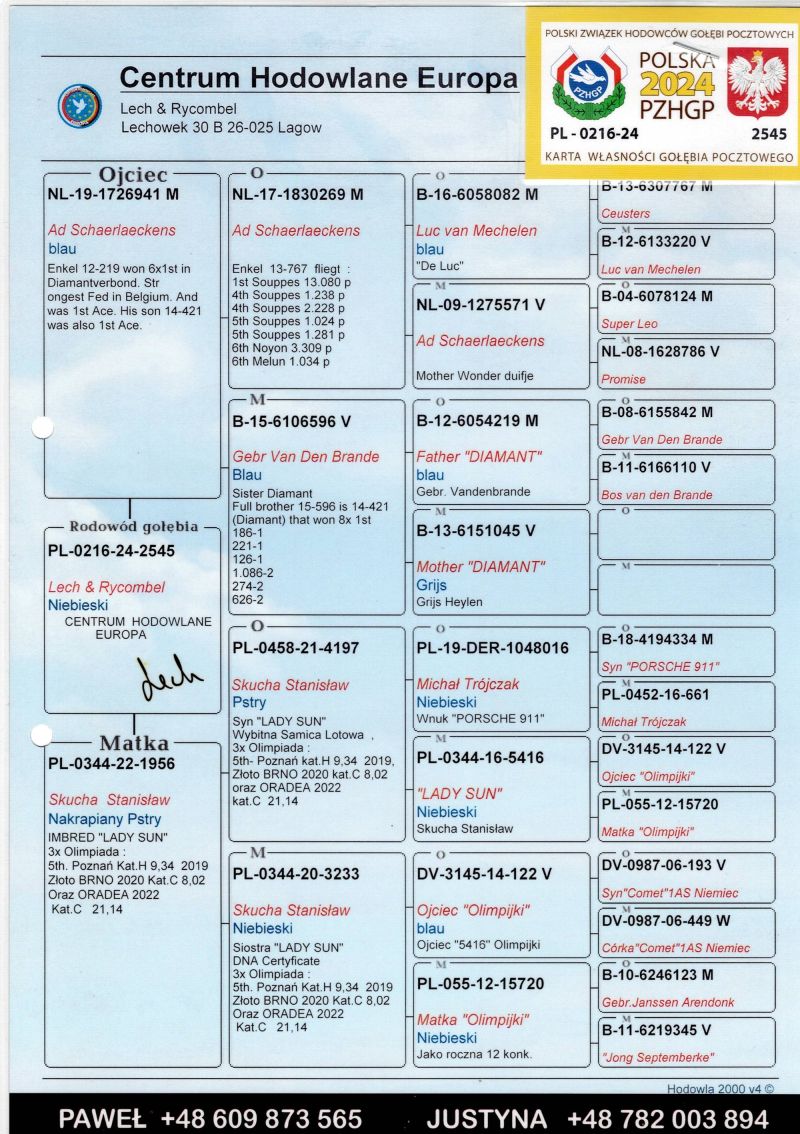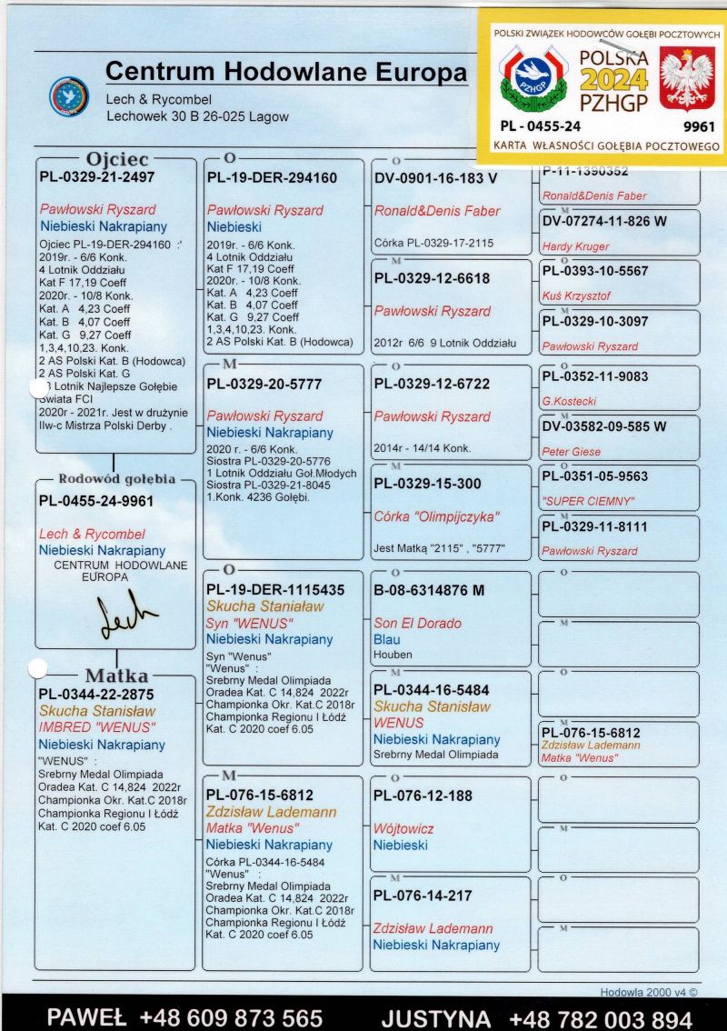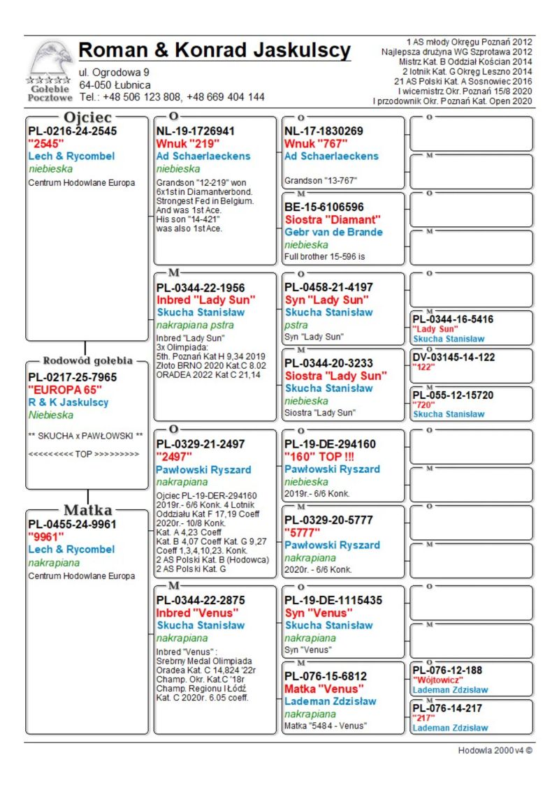 ***** UWAGA !!!!! Możliwy odbiór osobisty lub dostawa realizowana przez kuriera w cenie 160 zł !!!!! Możliwy także odbiór na wystawie Ogólnopolskiej w Katowicach (sobota lub niedziela). UZGODNIENIE TELEFONICZNE !!!!! <<<<< UWAGA, GOŁĄB TO PRAWDOPODOBNIE SAMIEC, NA POCZATKU GRUDNIA 1 LOTKA DO ZRZUCENIA >>>>> Oryginalny gołąb z hodowli Romana & Konrada Jaskulskich. Szczegóły pochodzenia w rodowodzie. Gołąb gotowy do sezonu lęgowego, zaszczepiony Columba PHA i Columba RP oraz przeciwko salmonellozie (Salmo PT). Więcej informacji pod nr tel.: 506 123 808. Wpłata za gołębia na konto po zakończeniu aukcji. Możliwy odbiór osobisty lub dostawa realizowana przez kuriera w cenie 160 zł. Możliwy także odbiór na wystawie Ogólnopolskiej w Katowicach (sobota lub niedziela).