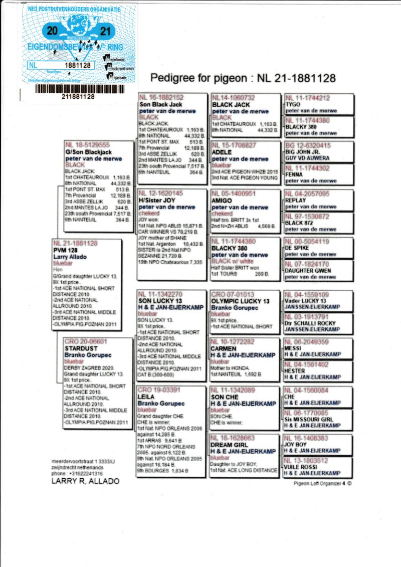 Oryginalny gołąb z hodowli Larry L. Allado, szczegóły pochodzenia w rodowodzie. Dostawa gołębi będzie realizowana po zakończeniu aukcji przez kuriera - 150zł. Możliwość odbioru na Wystawie Ogólnopolskiej (Sobota). Gołębie nie będą sprzedawane po za aukcją!