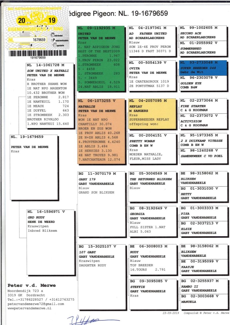 Oryginalny gołąb z hodowli Peter van de Merwe, szczegóły pochodzenia w rodowodzie. Dostawa gołębi będzie realizowana po zakończeniu aukcji przez kuriera - 150zł. Możliwość odbioru na Wystawie Ogólnopolskiej (Sobota). Gołębie nie będą sprzedawane po za aukcją!