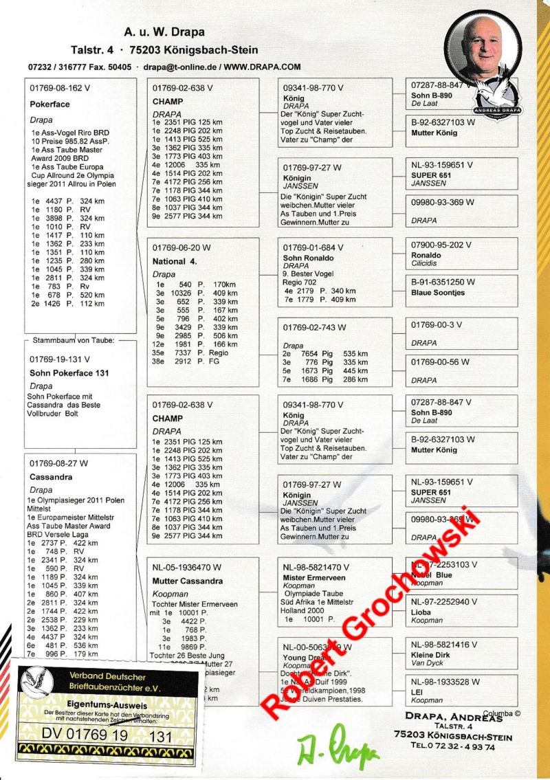 Oryginalny gołąb z hodowli Roberta Grochowskiego. Szczegóły pochodzenia w rodowodzie. Oferowany gołąb to prawdopodobnie SAMICA. Gołębia można obejrzeć w Urbanowicach woj. opolskie, po wcześniejszym kontakcie telefonicznym. Więcej informacji pod numerem 600133330. Sprzedający może zorganizować transport gołębia do najbliższego miasta od miejscowości kupującego za około 70-100zł Przy opcji "KUP TERAZ" transport gołębia GRATIS (do najbliższego miasta od miejsca zamieszkania kupującego).