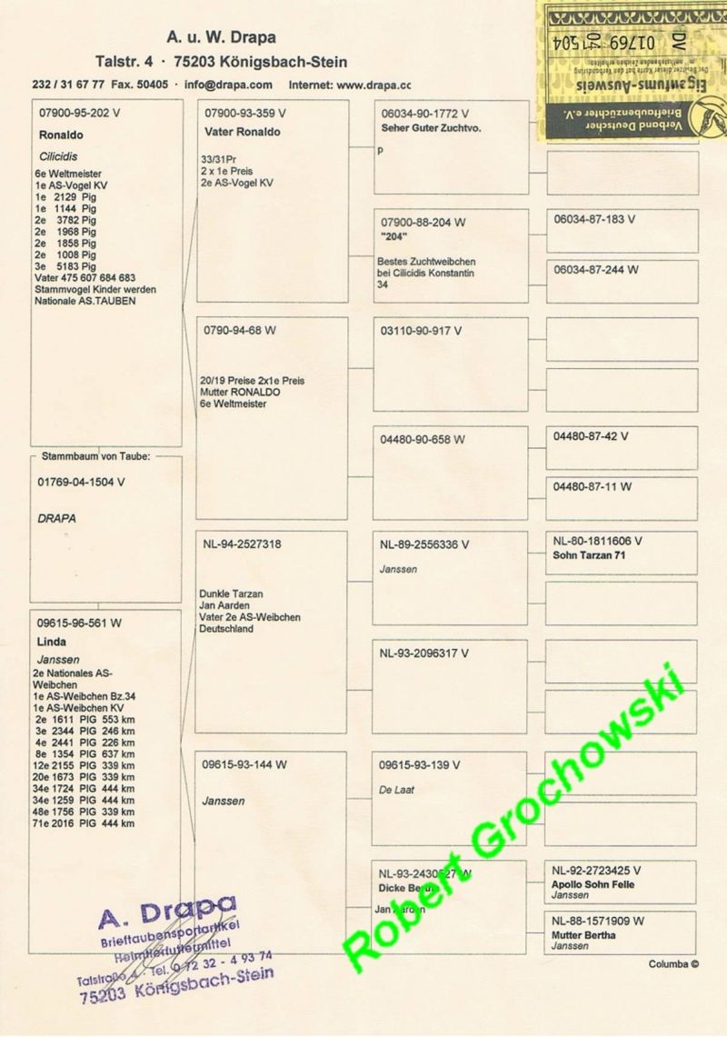 Oryginalny gołąb z hodowli Roberta Grochowskiego. Szczegóły pochodzenia w rodowodzie. Oferowany gołąb to prawdopodobnie SAMIEC. Gołębia można obejrzeć w Urbanowicach woj. opolskie, po wcześniejszym kontakcie telefonicznym. Więcej informacji pod numerem 600133330. Sprzedający może zorganizować transport gołębia do najbliższego miasta od miejscowości kupującego za około 70-100zł Przy opcji "KUP TERAZ" transport gołębia GRATIS (do najbliższego miasta od miejsca zamieszkania kupującego).