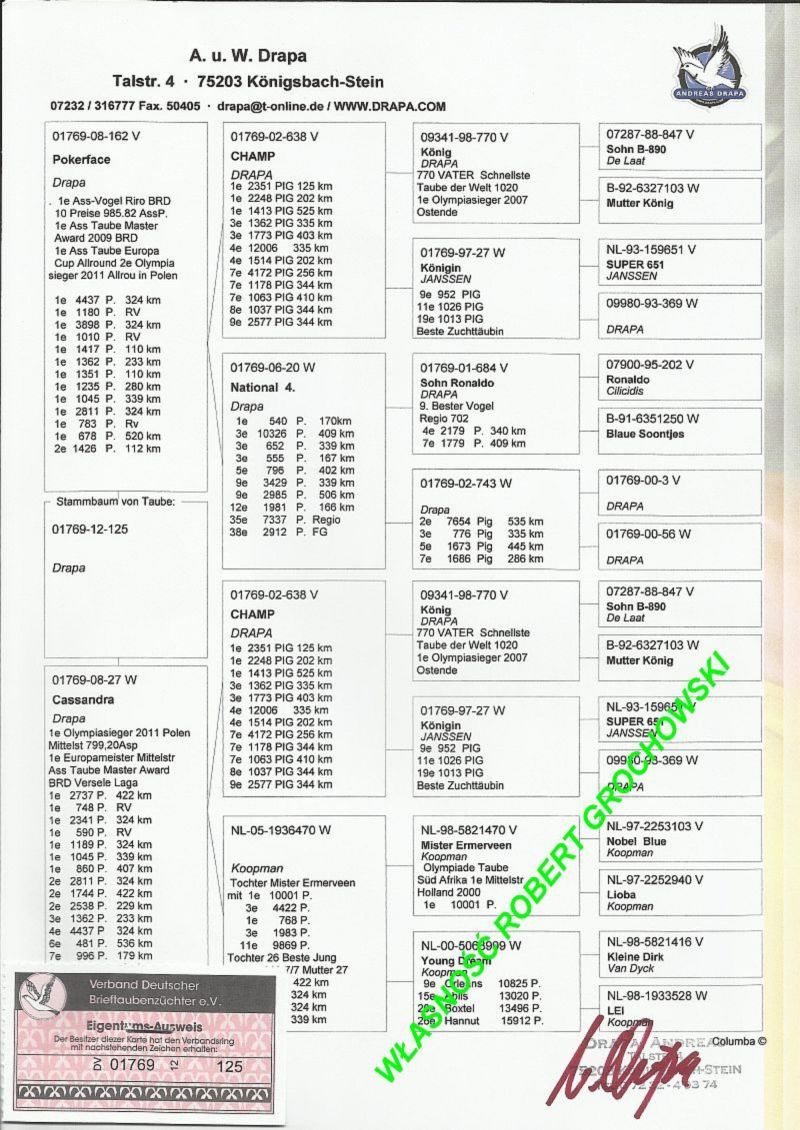 Oryginalny gołąb z hodowli Roberta Grochowskiego. Szczegóły pochodzenia w rodowodzie. Oferowany gołąb to prawdopodobnie SAMICA. Gołębia można obejrzeć w Urbanowicach woj. opolskie, po wcześniejszym kontakcie telefonicznym. Więcej informacji pod numerem 600133330. Sprzedający może zorganizować transport gołębia do najbliższego miasta od miejscowości kupującego za około 70-100zł Przy opcji "KUP TERAZ" transport gołębia GRATIS (do najbliższego miasta od miejsca zamieszkania kupującego).