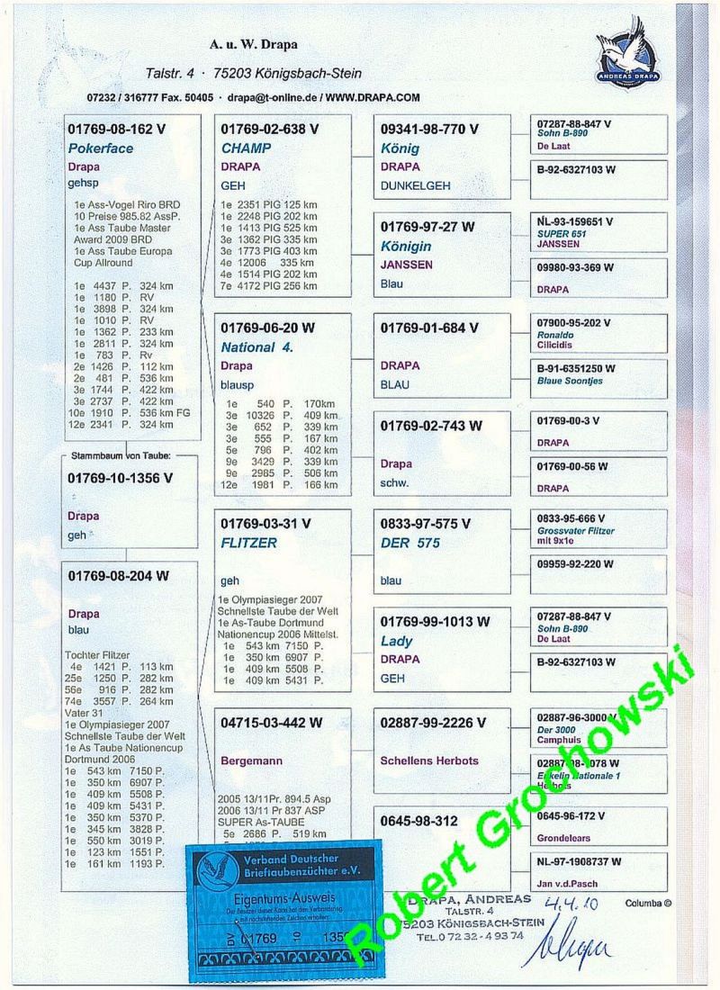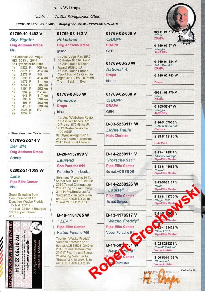 Oryginalny gołąb z hodowli Roberta Grochowskiego. Szczegóły pochodzenia w rodowodzie. Oferowany gołąb to prawdopodobnie SAMIEC. Gołębia można obejrzeć w Urbanowicach woj. opolskie, po wcześniejszym kontakcie telefonicznym. Więcej informacji pod numerem 600133330. Sprzedający może zorganizować transport gołębia do najbliższego miasta od miejscowości kupującego za około 70-100zł Przy opcji "KUP TERAZ" transport gołębia GRATIS (do najbliższego miasta od miejsca zamieszkania kupującego).