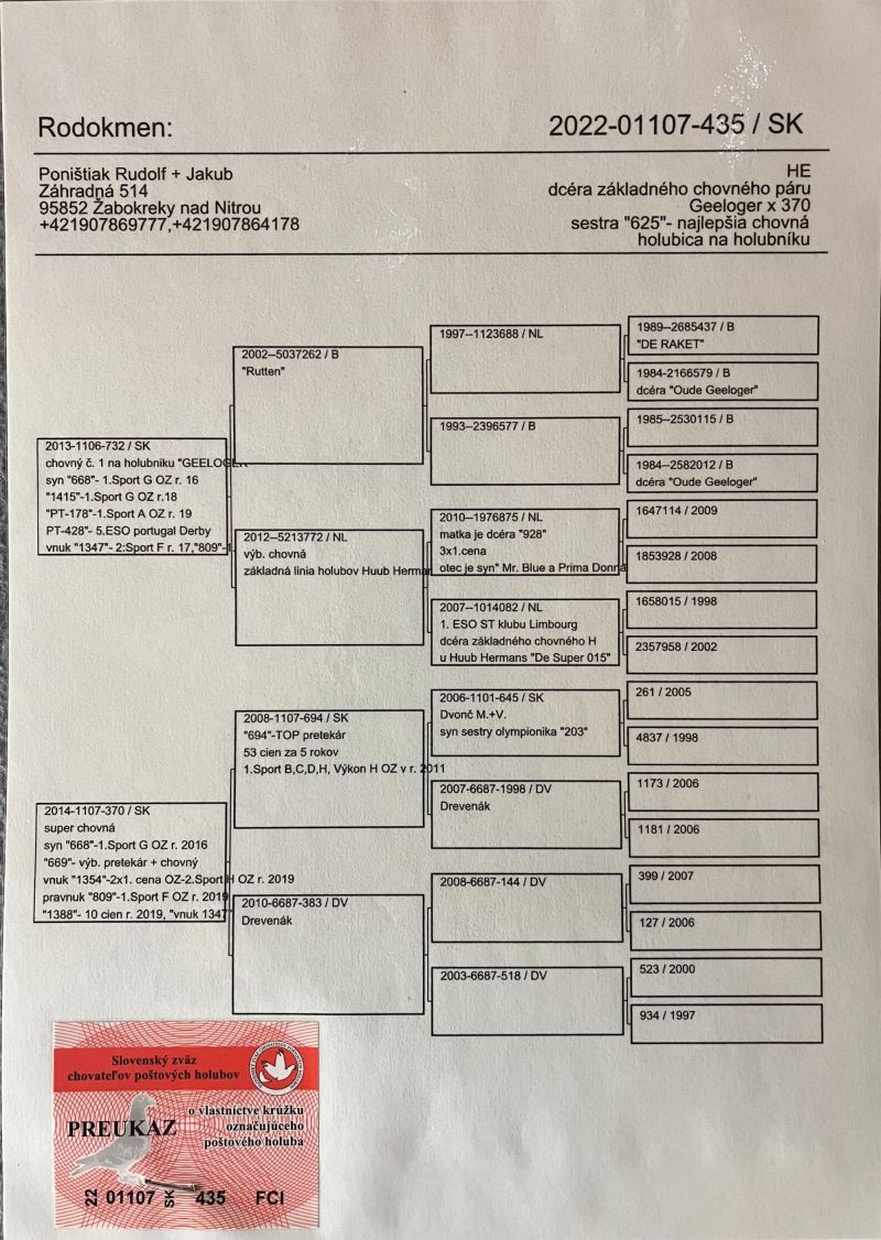Oryginalny gołąb z hodowli - Poništiak Rudolf + Jakub. Więcej informacji w rodowodzie oraz pod numerem telefonu: 509 924 243