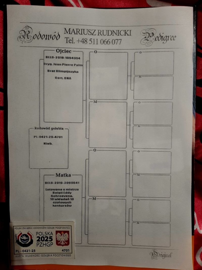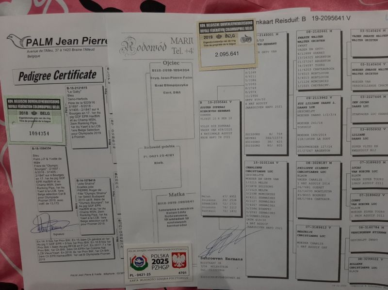 Ojciec to pełny brat 1 gołębia Belgii OLYMPIC BOURGES, a matka lotowana z sukcesami u mistrza Belgii Eddy Schroevena. Eddy Schroeven miał 6 gołębi olimpijskich w 2022 roku. Szczegóły pochodzenia w rodowodzie i pod nr tel. 696 241 555