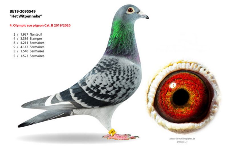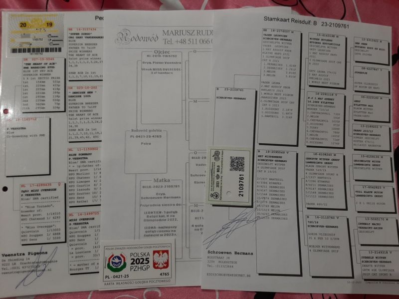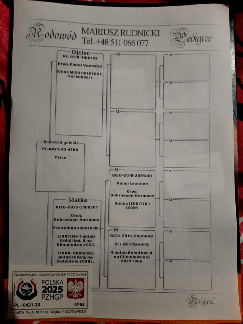 Matka oryg. Schroeven- mistrz Belgii. Przyrodnia siostra (ten sam ojciec) do LEONY- najlepszy roczny na świecie w 2023 roku, LEONTIEN- 1 gołąb Belgii kat. H na Olimpiadzie w 2022 roku. Eddy Schroeven miał tam 6 gołębi olimpijskich. Ojciec od Pietera Veenstry. Szczegóły pochodzenia w rodowodzie i pod nr tel. 696 241 555
