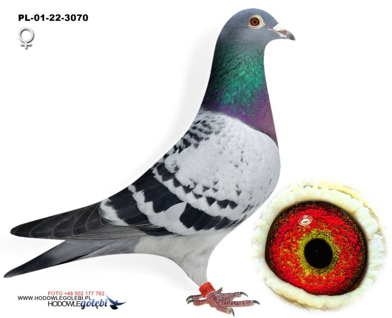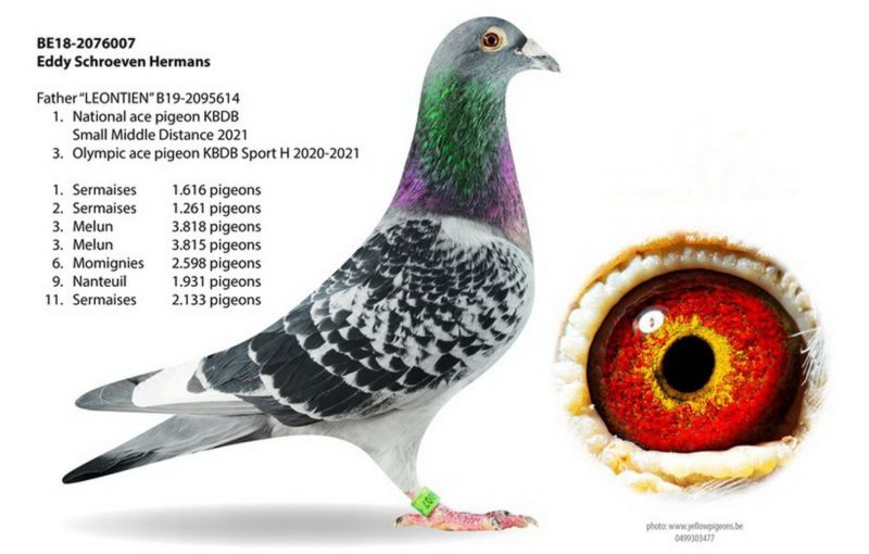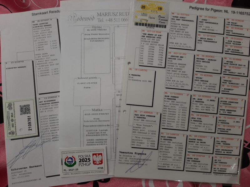 Matka oryg. Schroeven- mistrz Belgii. Przyrodnia siostra (ten sam ojciec) do LEONY- najlepszy roczny na świecie w 2023 roku, LEONTIEN- 1 gołąb Belgii kat. H na Olimpiadzie w 2022 roku. Eddy Schroeven miał tam 6 gołębi olimpijskich. Ojciec od Pietera Veenstry. Szczegóły pochodzenia w rodowodzie i pod nr tel. 696 241 555
