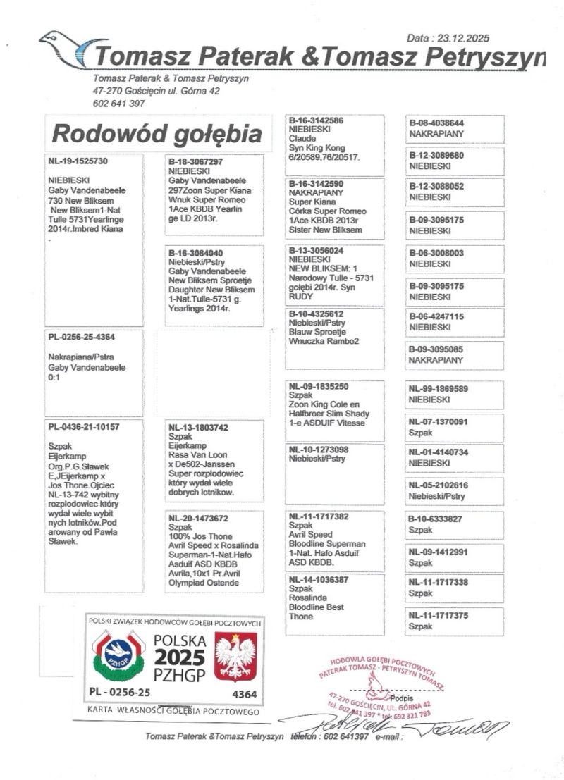 Oryginalny gołąb z hodowli Tomasz Paterak & Tomasz Petryszyn. Więcej informacji pod nr tel. 692321783, 602 641 397 Możliwy darmowy odbiór na Wystawie Ogólnopolskiej Katowice.