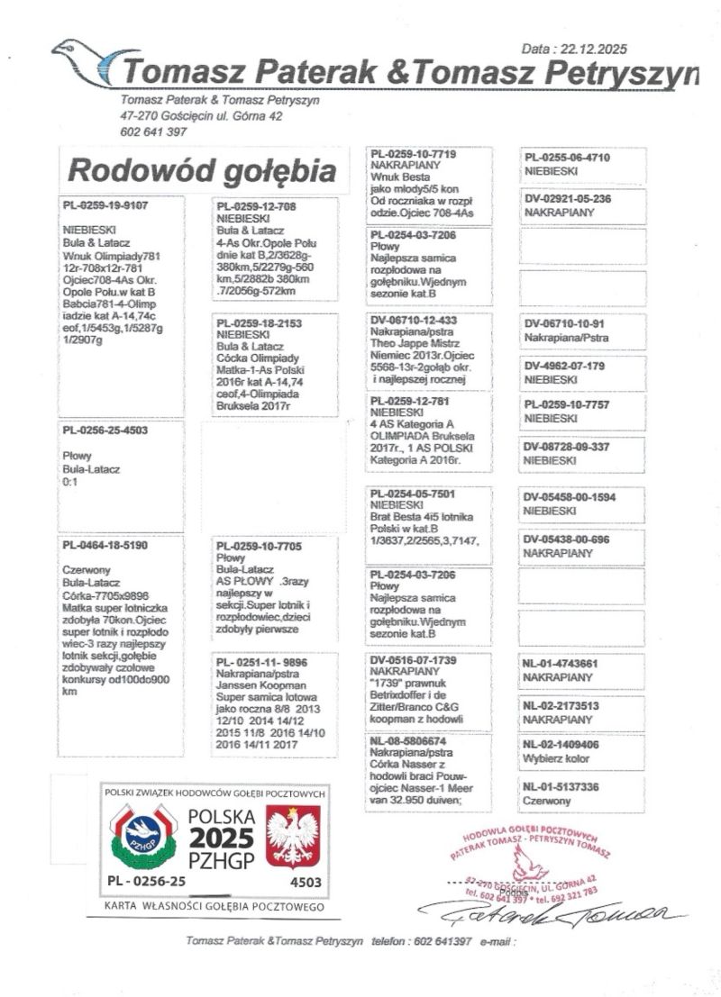 TYLKO KUP TERAZ Oryginalny gołąb z hodowli Tomasz Paterak & Tomasz Petryszyn. Więcej informacji pod nr tel. 692321783, 602 641 397 Możliwy darmowy odbiór na Wystawie Ogólnopolskiej Katowice.