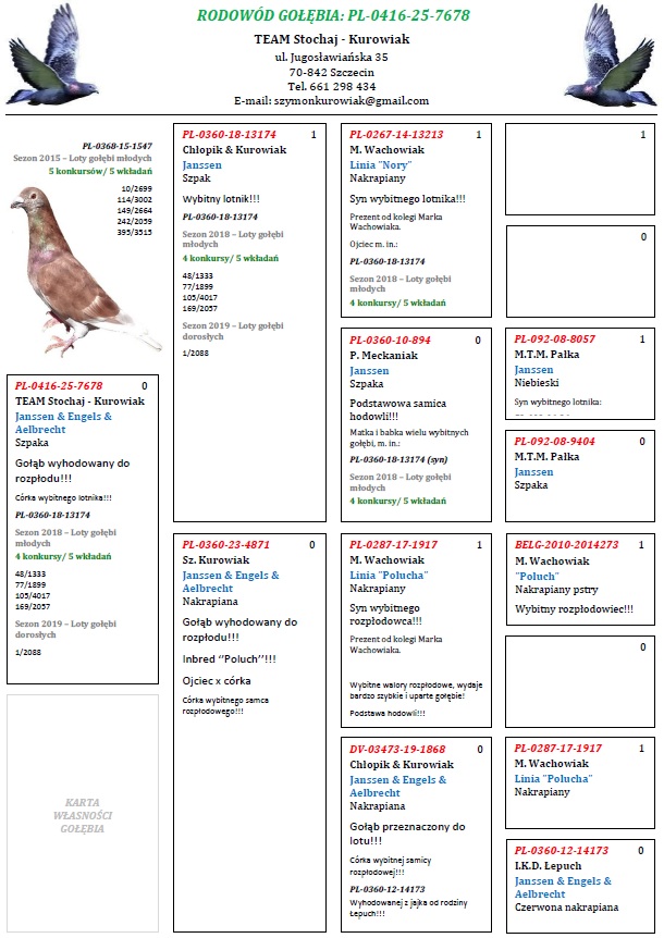 Oryginalny gołąb z hodowli Team Sochaj-Kurowiak. Szczegóły pochodzenia w rodowodzie. Więcej informacji pod nr tel.: 608 636 232 (Leszek), 661 298 434 (Szymon) *koszty transportu 150 zł, istnieje również możliwość odbioru wylicytowanych ptaków na wystawie w Katowicach
